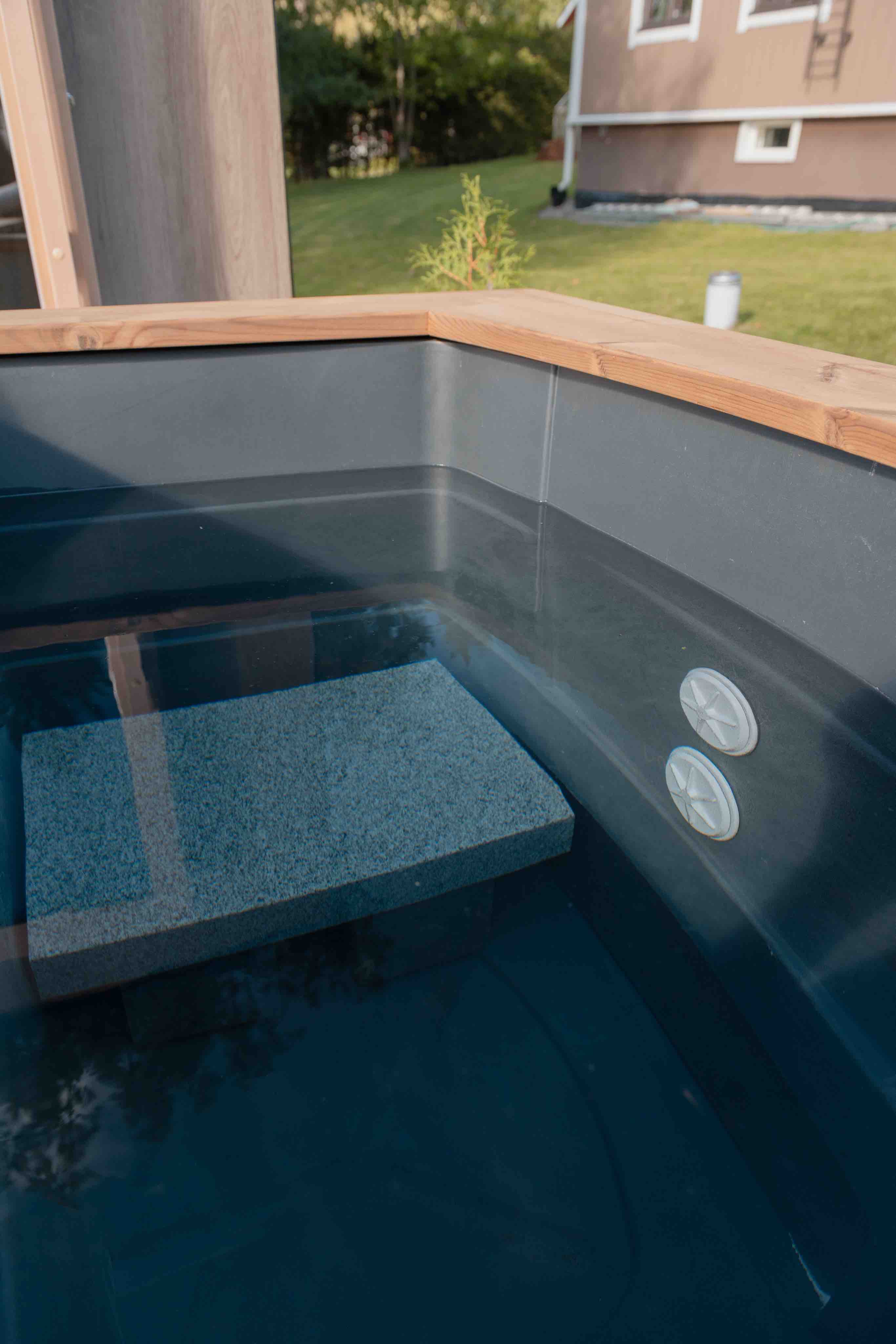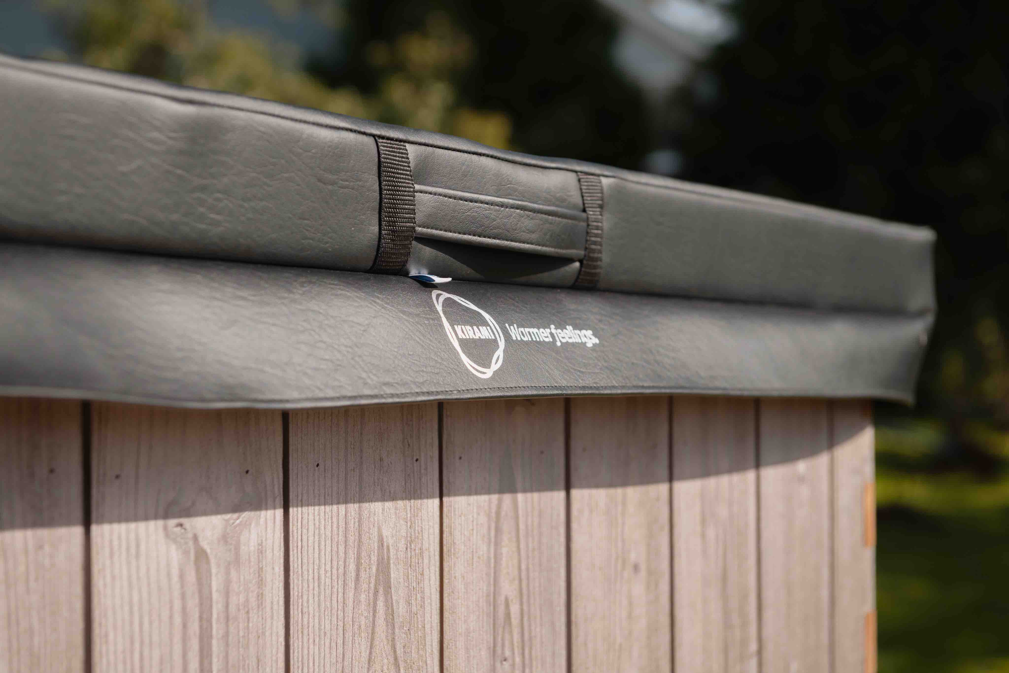 Die Außenverkleidung besteht aus wärmebehandeltem Kiefernholz mit einer grau lackierten und gebürsteten Paneeloberfläche. Die Ecken des Beckens sind auf elegante Weise mit Keilzinkenverbindungen abgeschlossen. Der obere Rand des Beckens ist mit einem separaten Rahmen aus wärmebehandeltem Kiefernholz versehen, der das Becken und die Außenverkleidung nahtlos miteinander verbindet. Der Rahmen wurde mit einem durchscheinenden Öl geölt. Thermoholz ist ein langlebiges, hochwertiges und formbeständiges Material. Das Innenbecken präsentiert sich in dunkelgrauem, pflegeleichtem Kunststoff. Die zeitlose und trendige graue Farbe fügt sich in jeden Garten ein.
