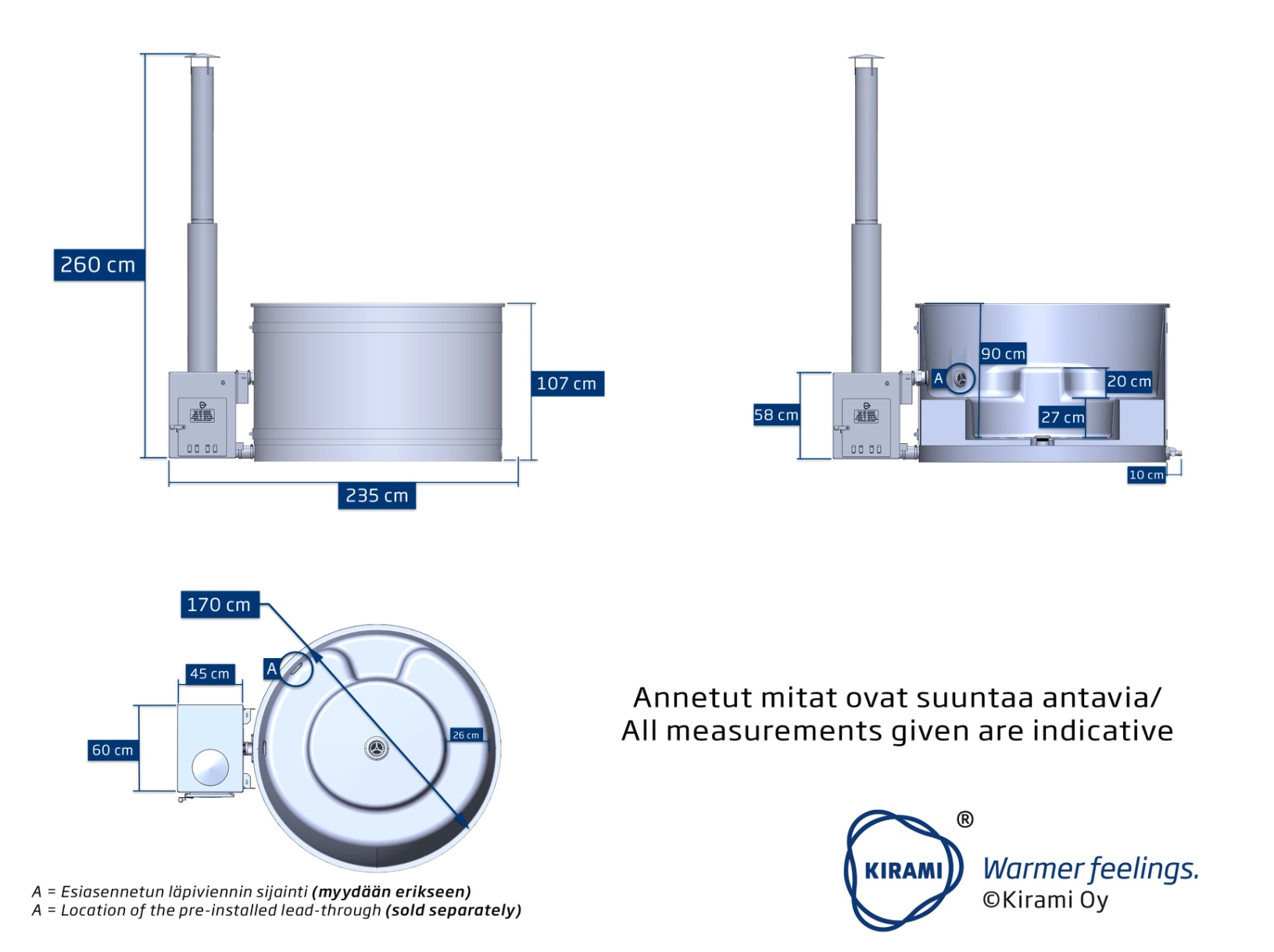 Der Durchmesser des Fasses beträgt 170 cm bei einem Fassungsvermögen von 1420 l und einem Trockengewicht von 157 kg. Das Badefass bietet Platz für 4-6 Personen. Die Bruttoleistung des MACU-Ofens liegt bei 40 kW und die dem Wasser gelieferte Leistung bei 29 kW.