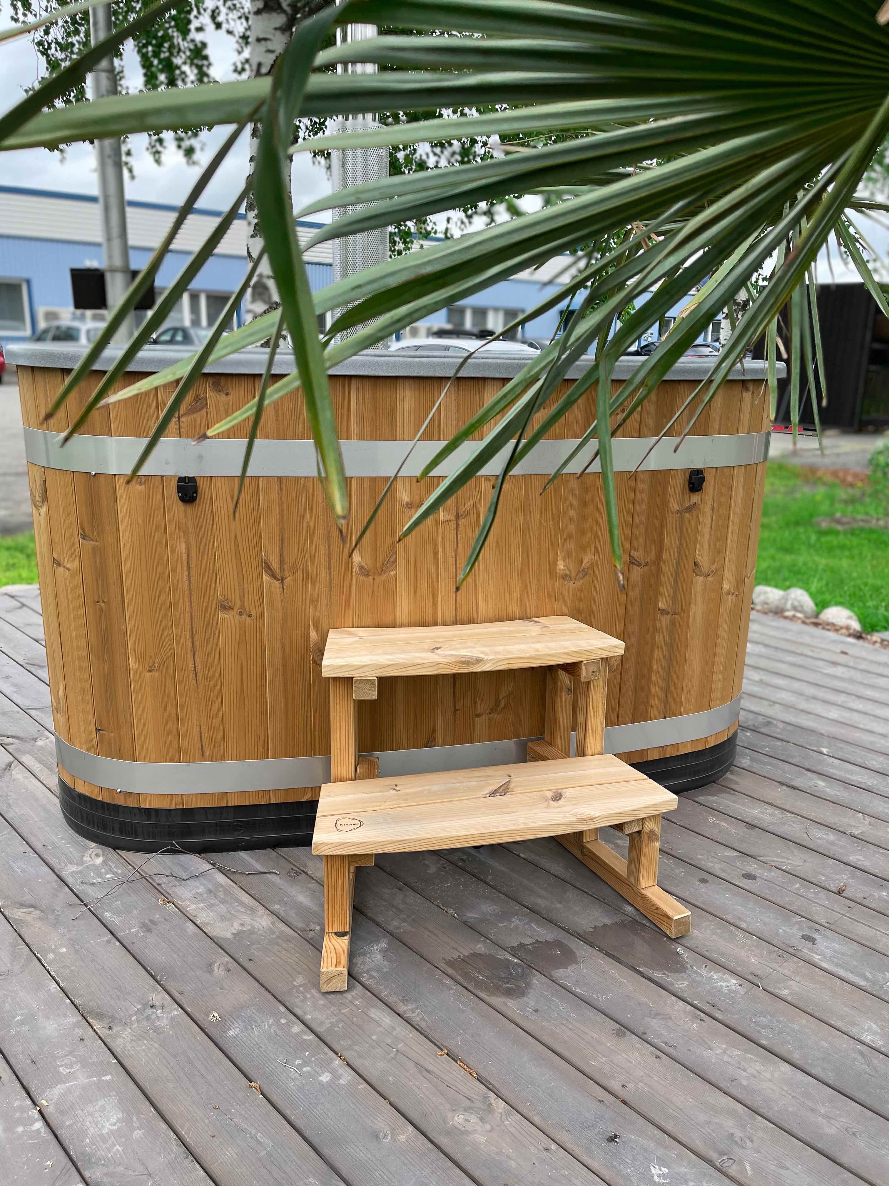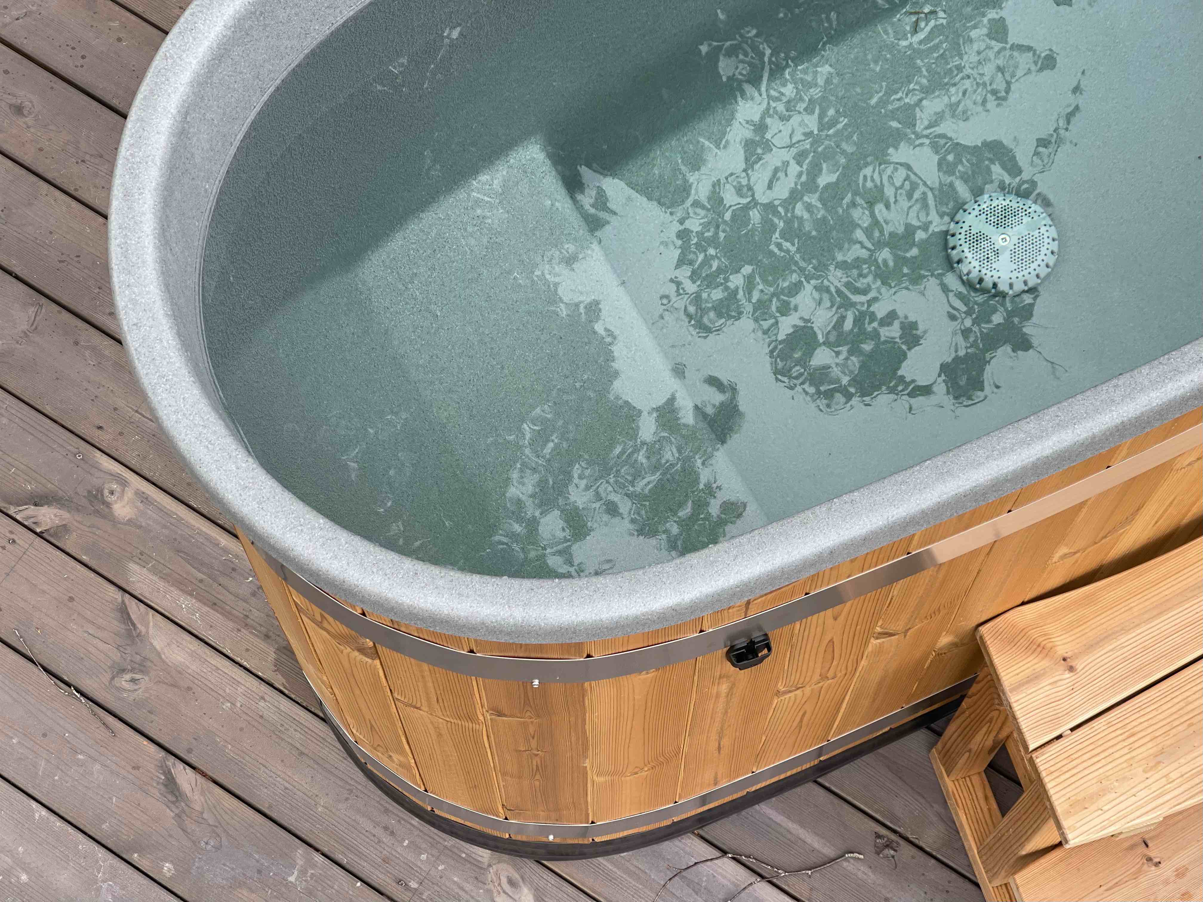 Die als Außenverkleidung dienende wärmebehandelte Kiefer ist eine einheimische Alternative zu dunklem Importholz. Thermoholz ist ein langlebiges und hochwertiges Material mit einem warmen braunen Farbton, welches seine Form beibehält. Die durchscheinende, hellgraue Innenwanne wird durch den leichten “Flöckchen-Effekt” optisch zusätzlich aufgewertet. Die helle Farbe des Innenbeckens ist ebenso zeitlos wie trendy und fügt sich wunderbar in die Umgebung ein.