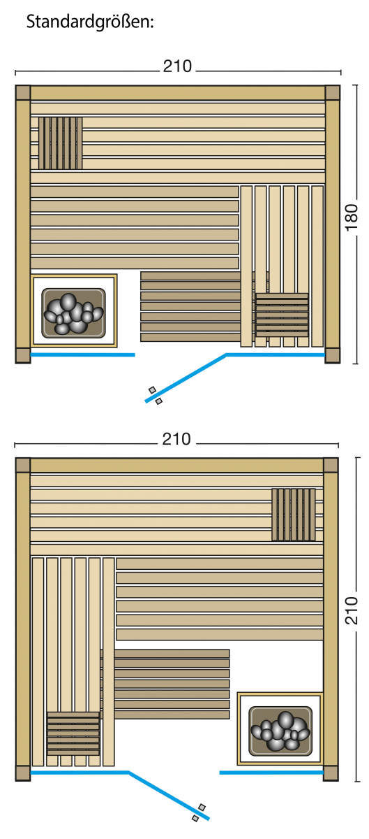 Varianten mit Saunaofen finnischer Ofen inkl. Steuerung und Silikonkabel (Hotline V4 (9 kW), Saunasteuerung Saunacontrol A, 15 kg Saunasteine):