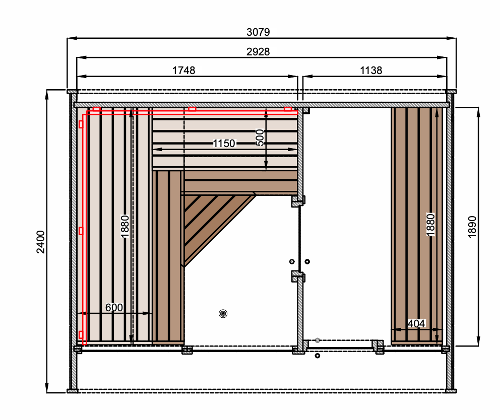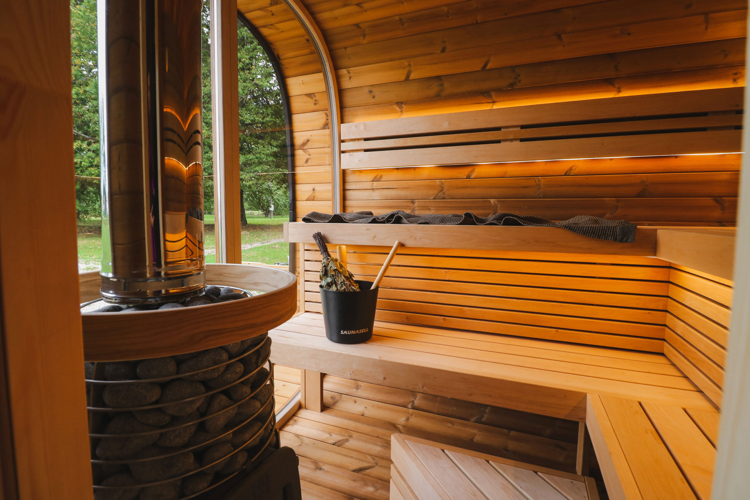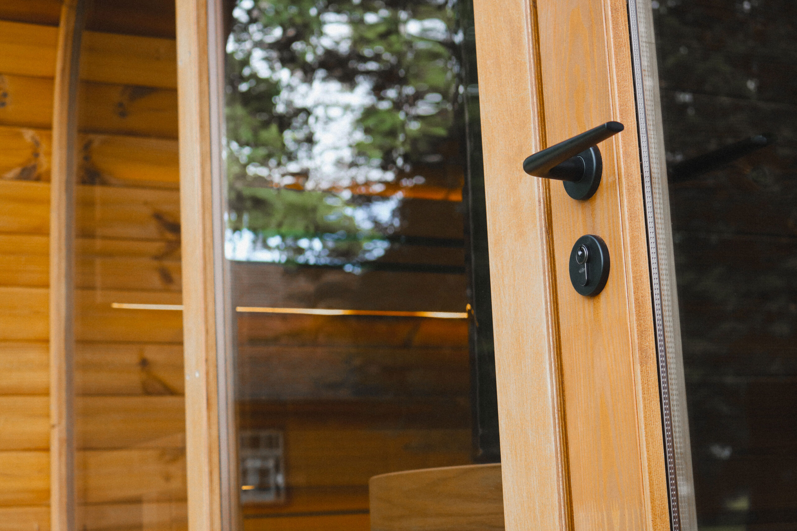 Round Cube Double – eine durchdacht gestaltete Zweiraumsauna mit einer Gesamtfläche von 7,2 Quadratmetern. Das Modell DOUBLE ist praktisch und eignet sich für diejenigen, die zusätzlich zum Dampfbad einen zusätzlichen Raum benötigen. Ob Sie beim Saunagang lieber sitzen oder liegen, dank der cleveren Raumaufteilung ist beides möglich. Die L-förmige Sitzbank bietet bequemen Sitzplatz für bis zu 5 Personen.