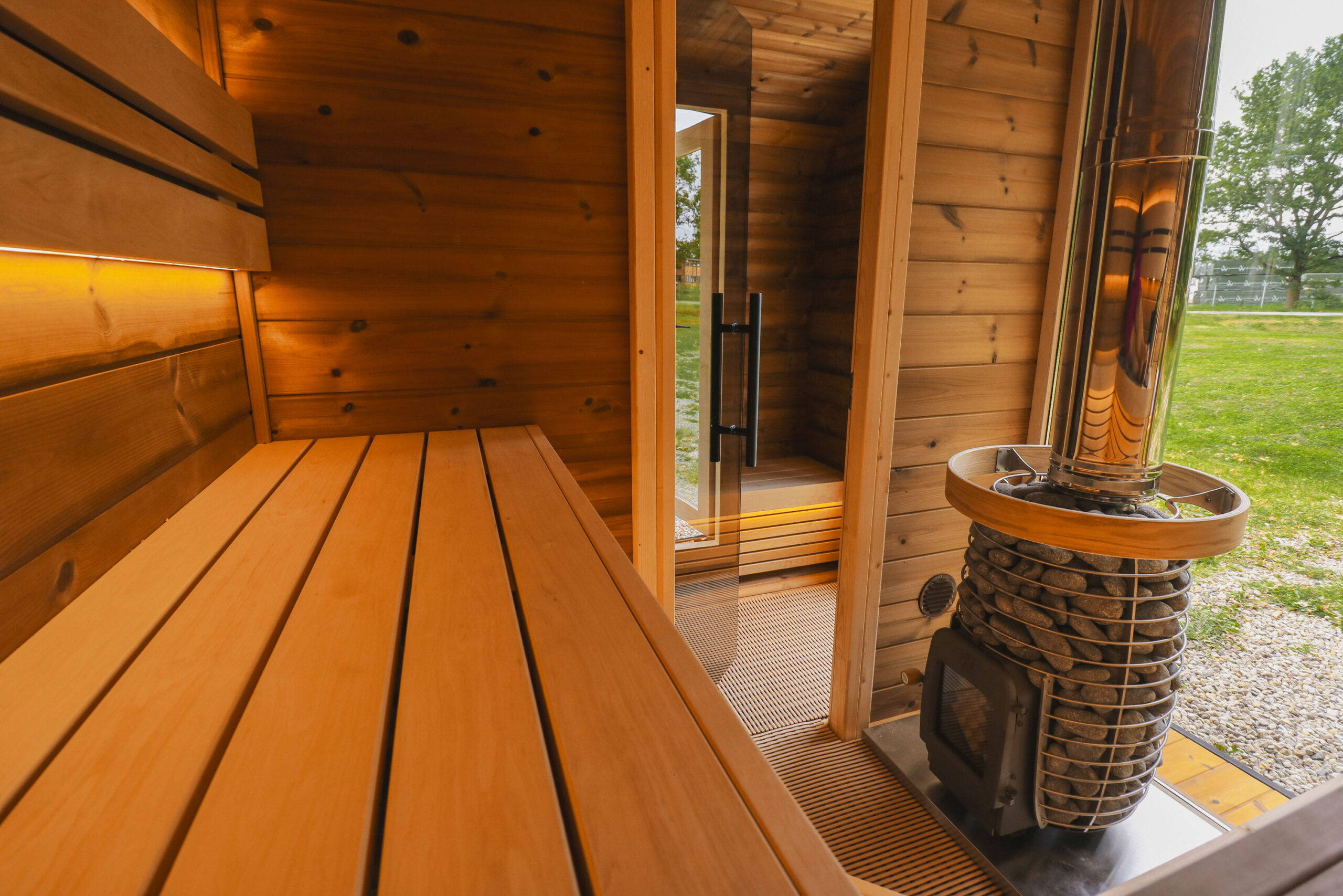 Round Cube DOUBLE bietet sowohl Luxus als auch Funktionalität in einem eleganten Paket – ein geräumiges Dampfbad und ein gemütliches Wohnzimmer, das den perfekten Raum zum Ausruhen zwischen Saunagängen oder Kleidungswechseln bietet.