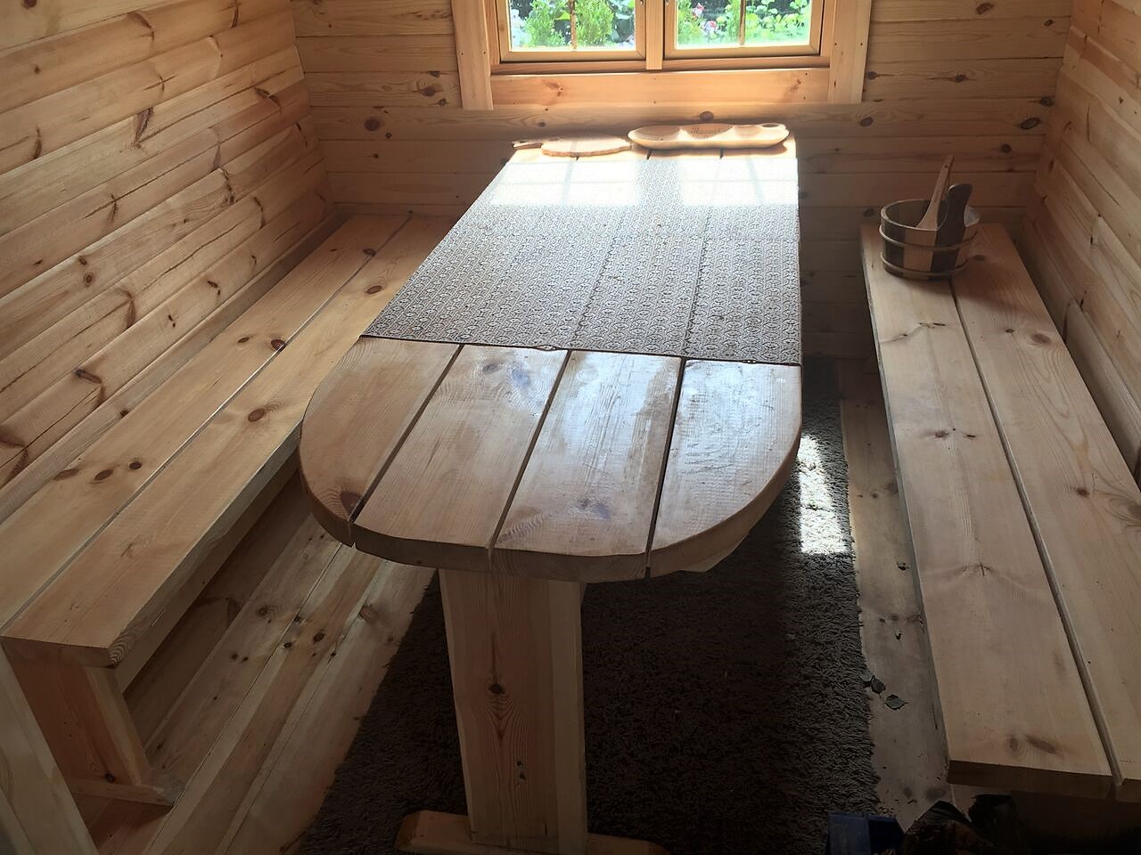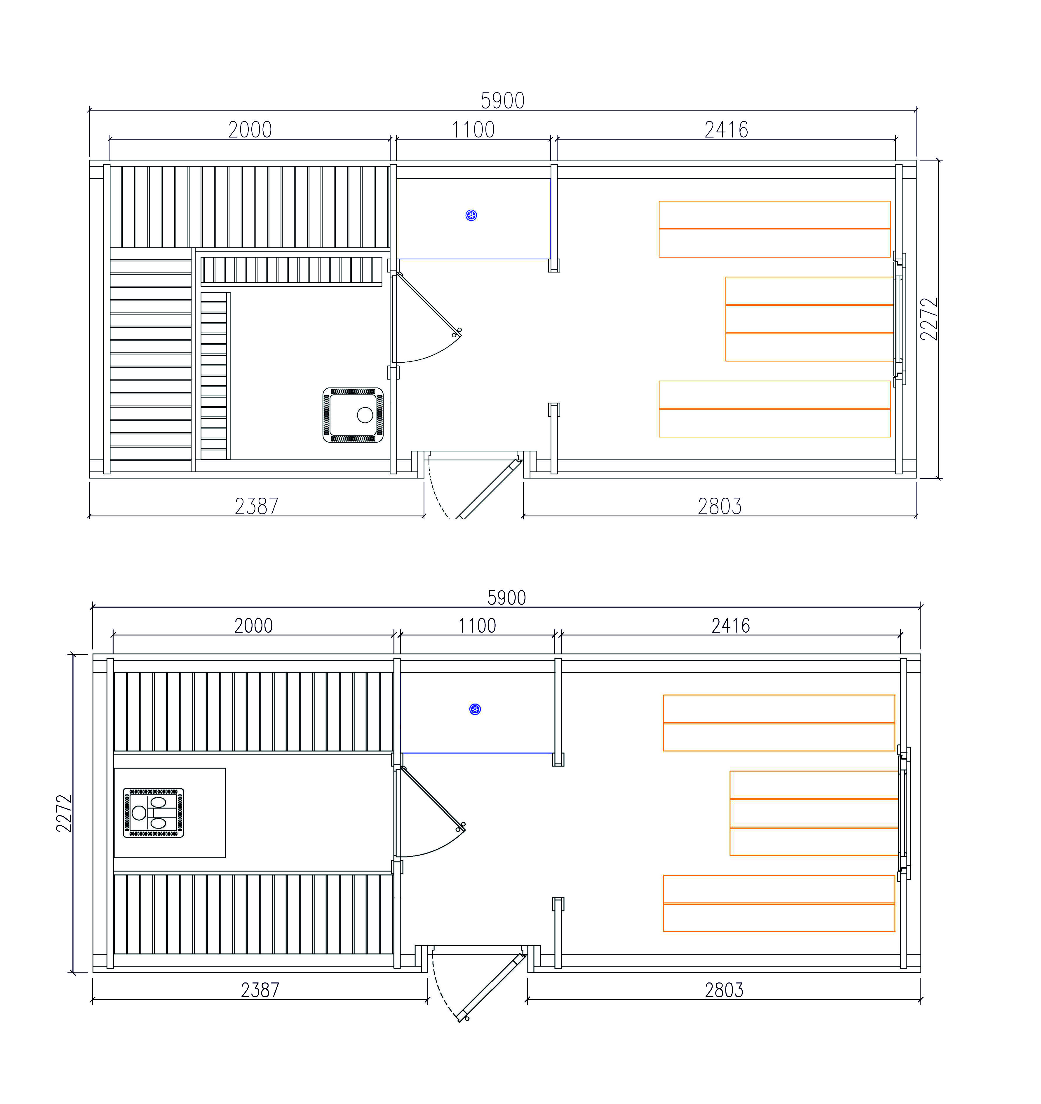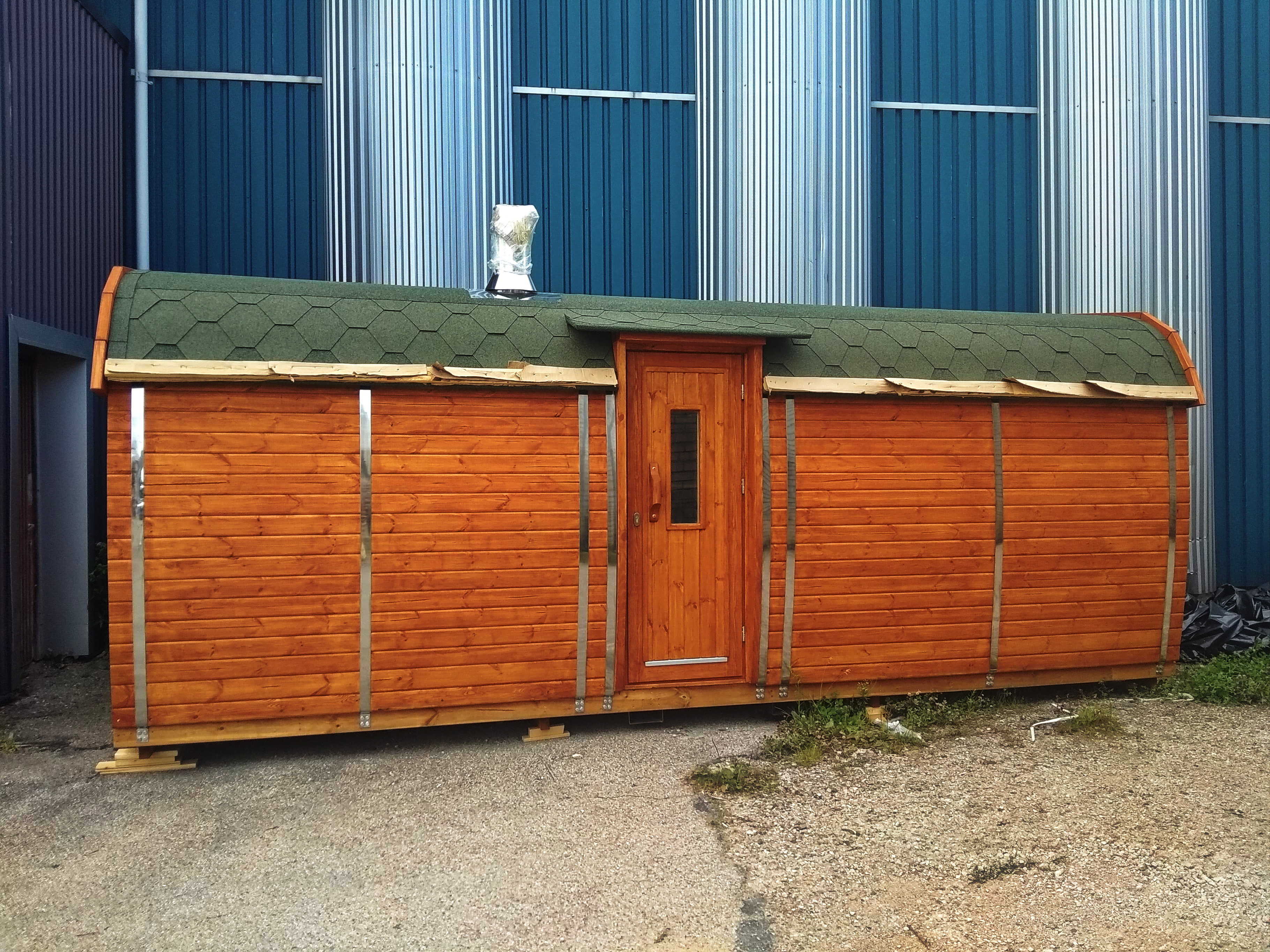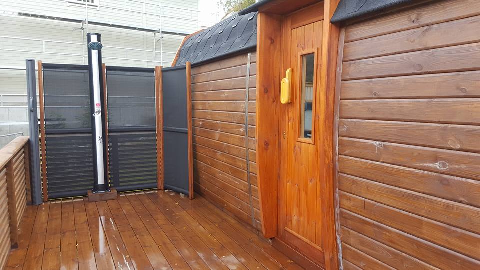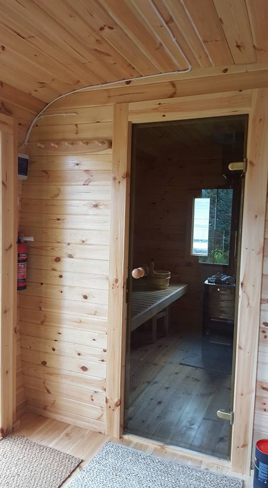 Spezifikationen: Länge: 590 cm Breite/Durchmesser: 230 cm Personen: 6 - 10 Holzarten: Pinie oder Thermoholz Wandstärke: 46 mm Türgröße Holztüre: 700 x 1800 mm Türgröße Glastüre: 620 x 1750 mm Layout: Gerade Bänke oder Eckbänke