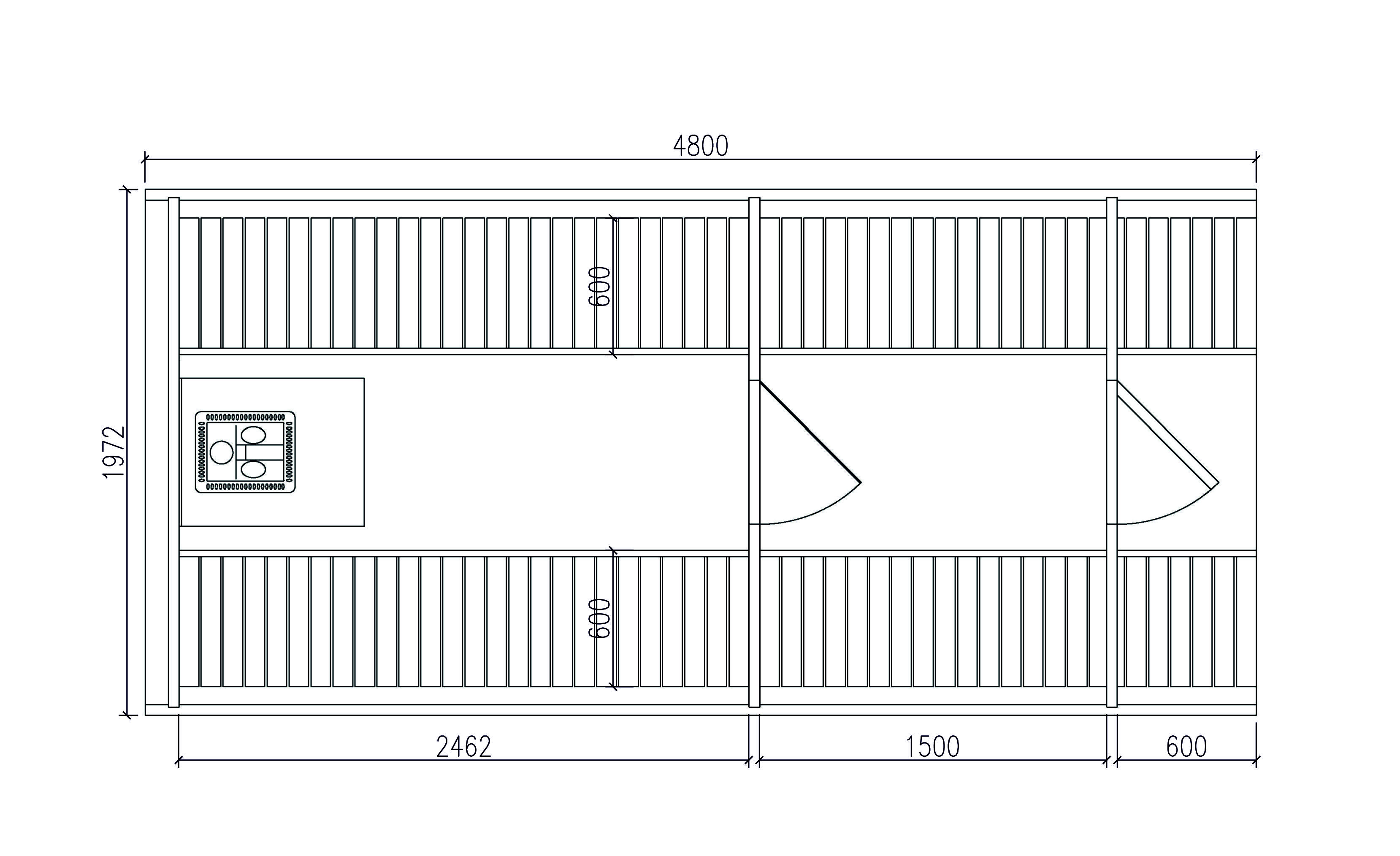 Layout mit Vorraum und Veranda: 60 cm Veranda / 150 cm Vorraum / 246,2 cm Saunaraum