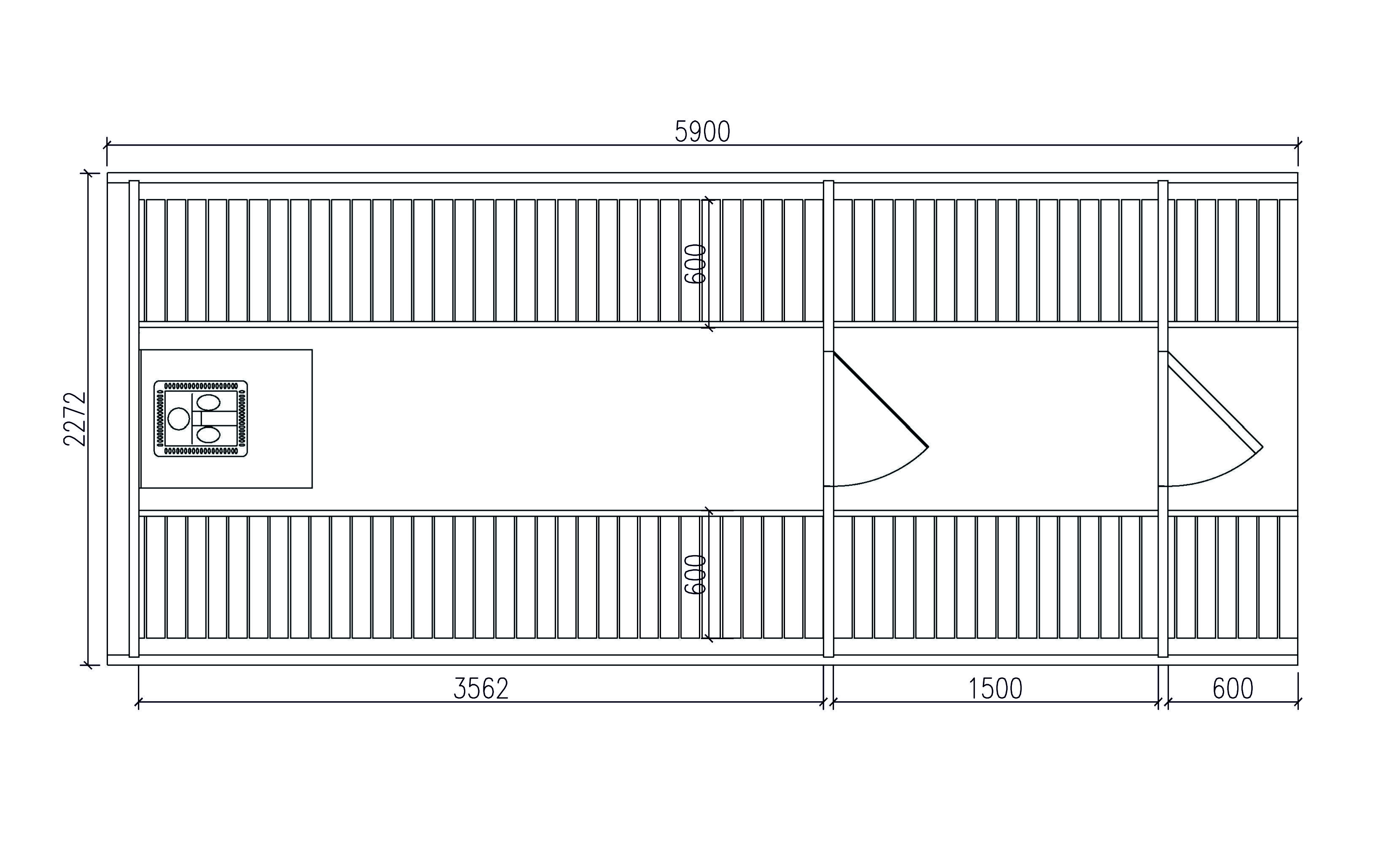 Layout mit Vorraum und Veranda: 60 cm Veranda / 150 cm Vorraum / 356,2 cm Saunaraum