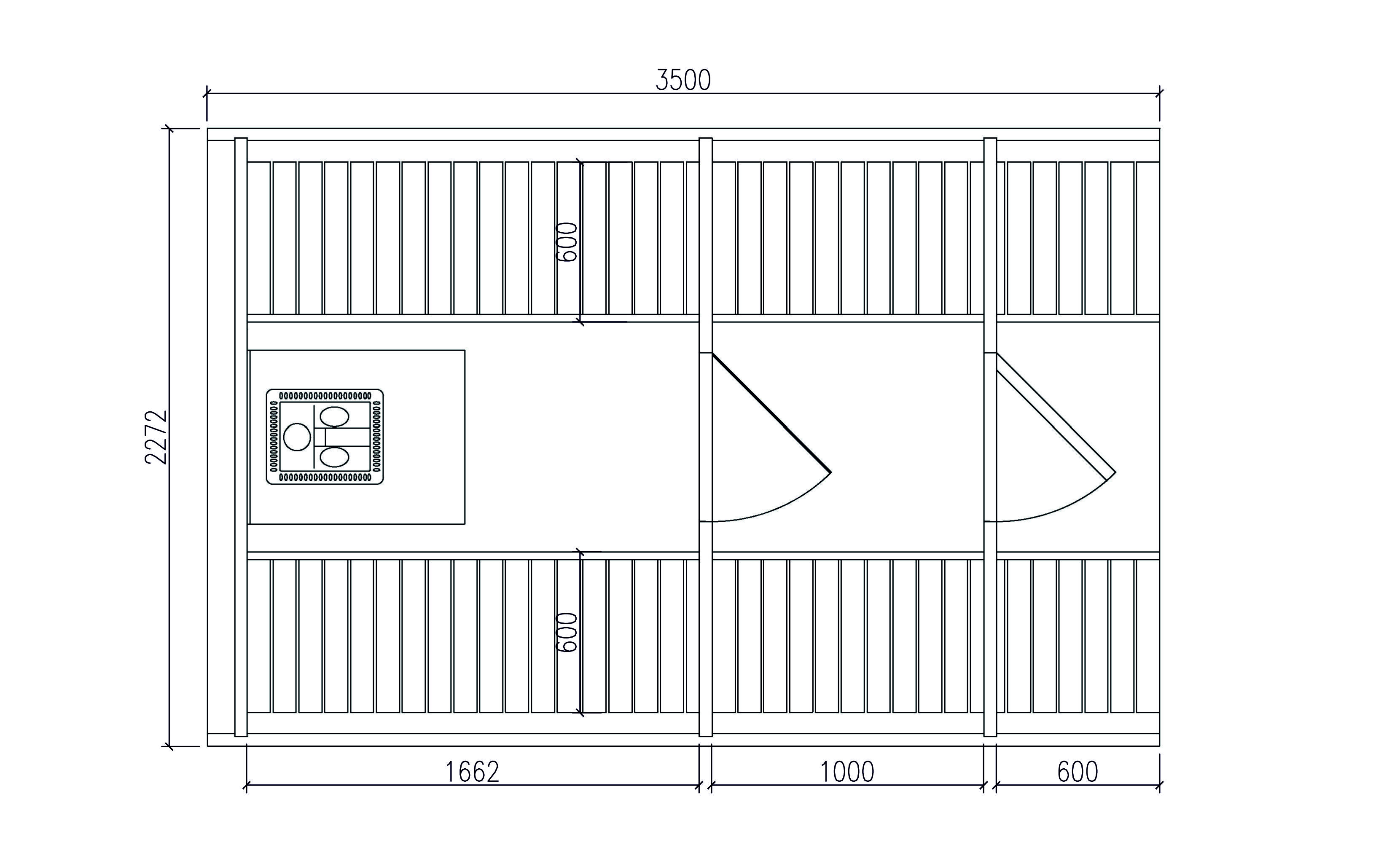 Layout mit Vorraum und Veranda: 60 cm Veranda / 100 cm Vorraum / 166,2 cm Saunaraum