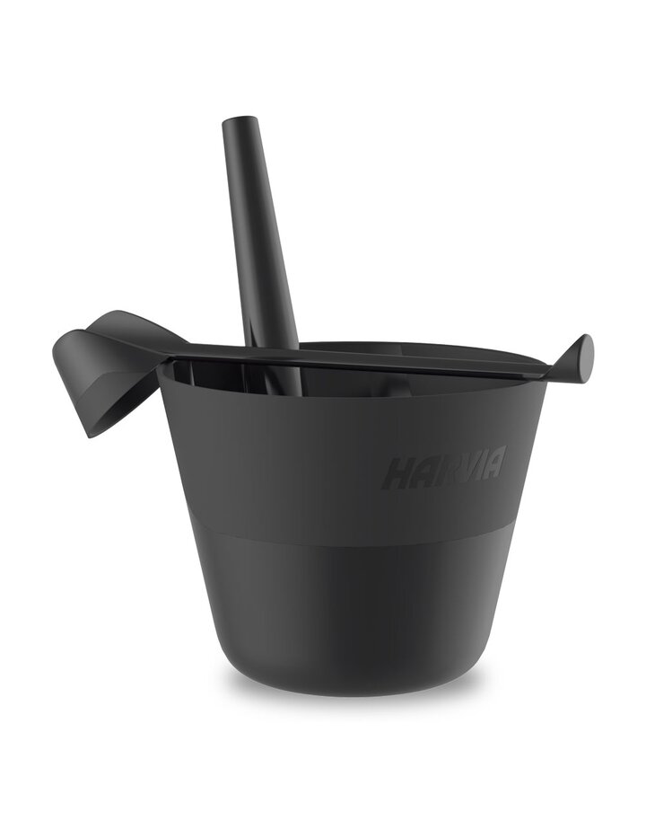 Das Harvia Set besteht aus einem Eimer und einer Kelle aus schwarzem Kunststoff, hergestellt aus recycletem Material. Dadurch ist es sehr leicht zu handhaben und zu tragen. Eimer und Kelle wurden ergonomisch gestaltet, die Kelle kann bequem zur Aufbewahrung auf den 7-Liter Eimer gestellt werden.