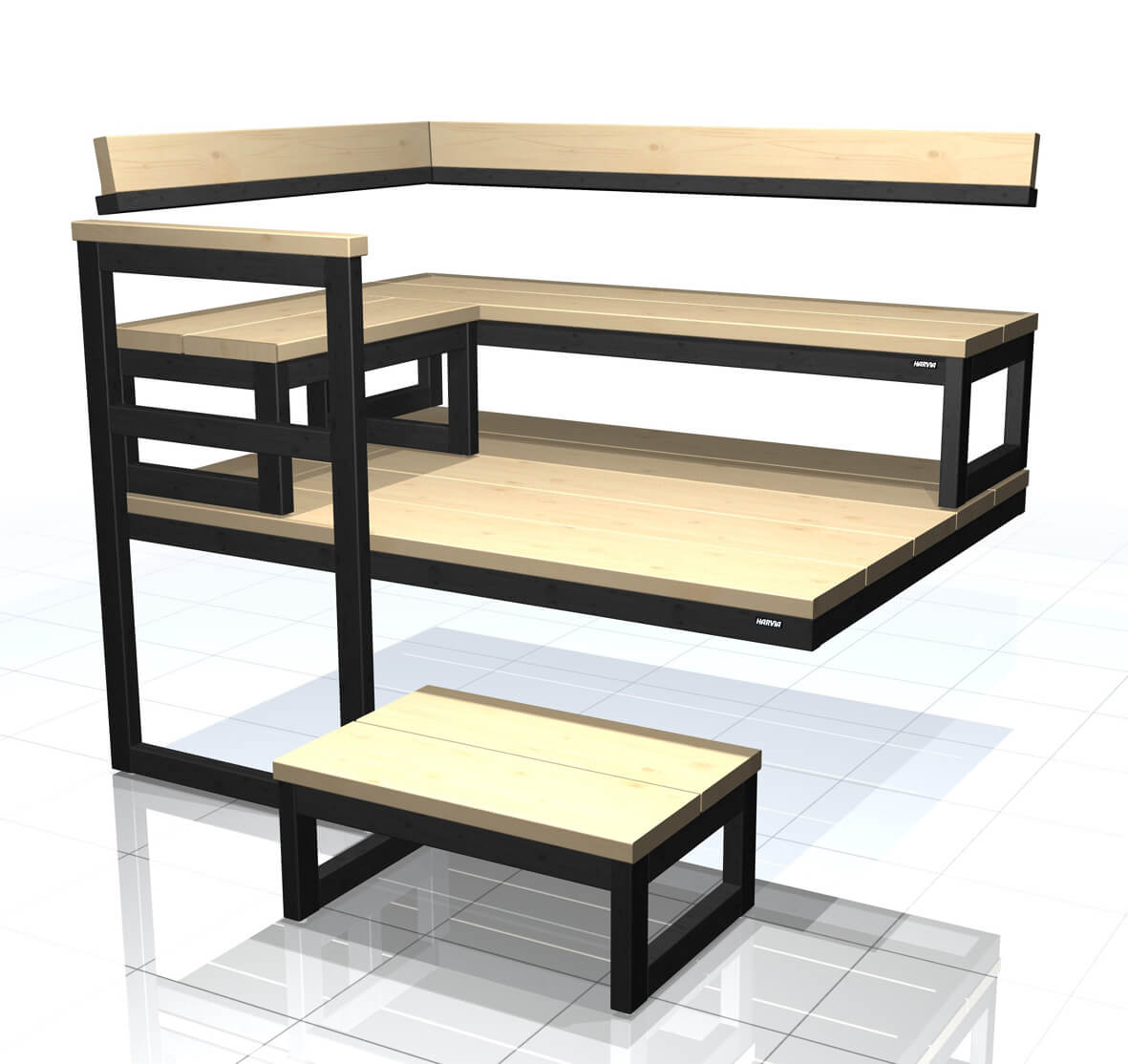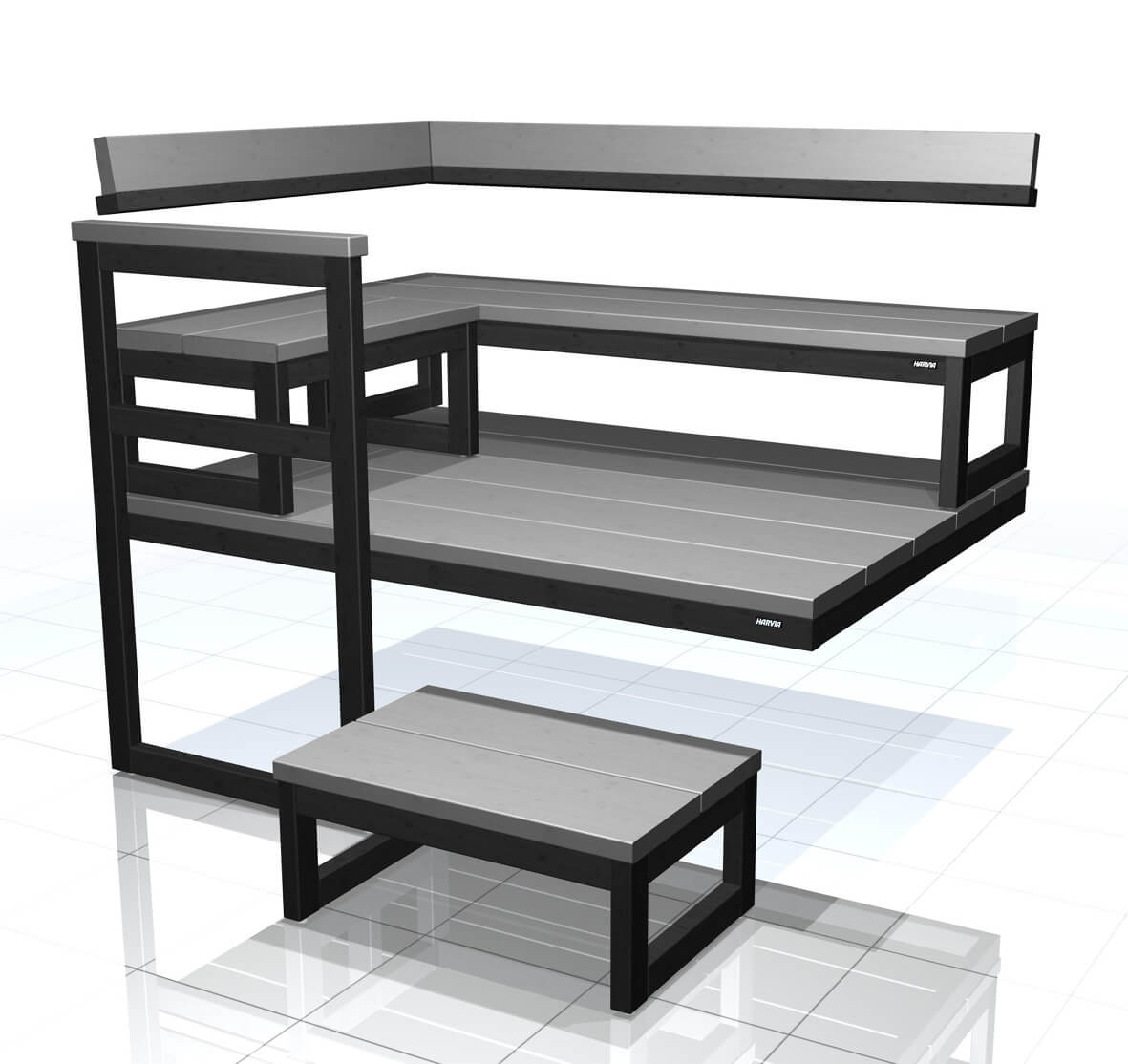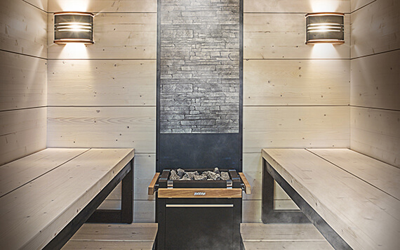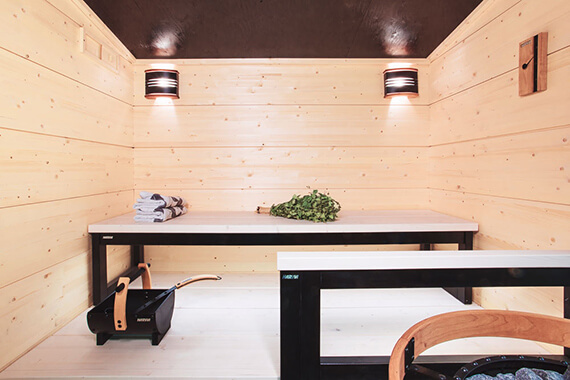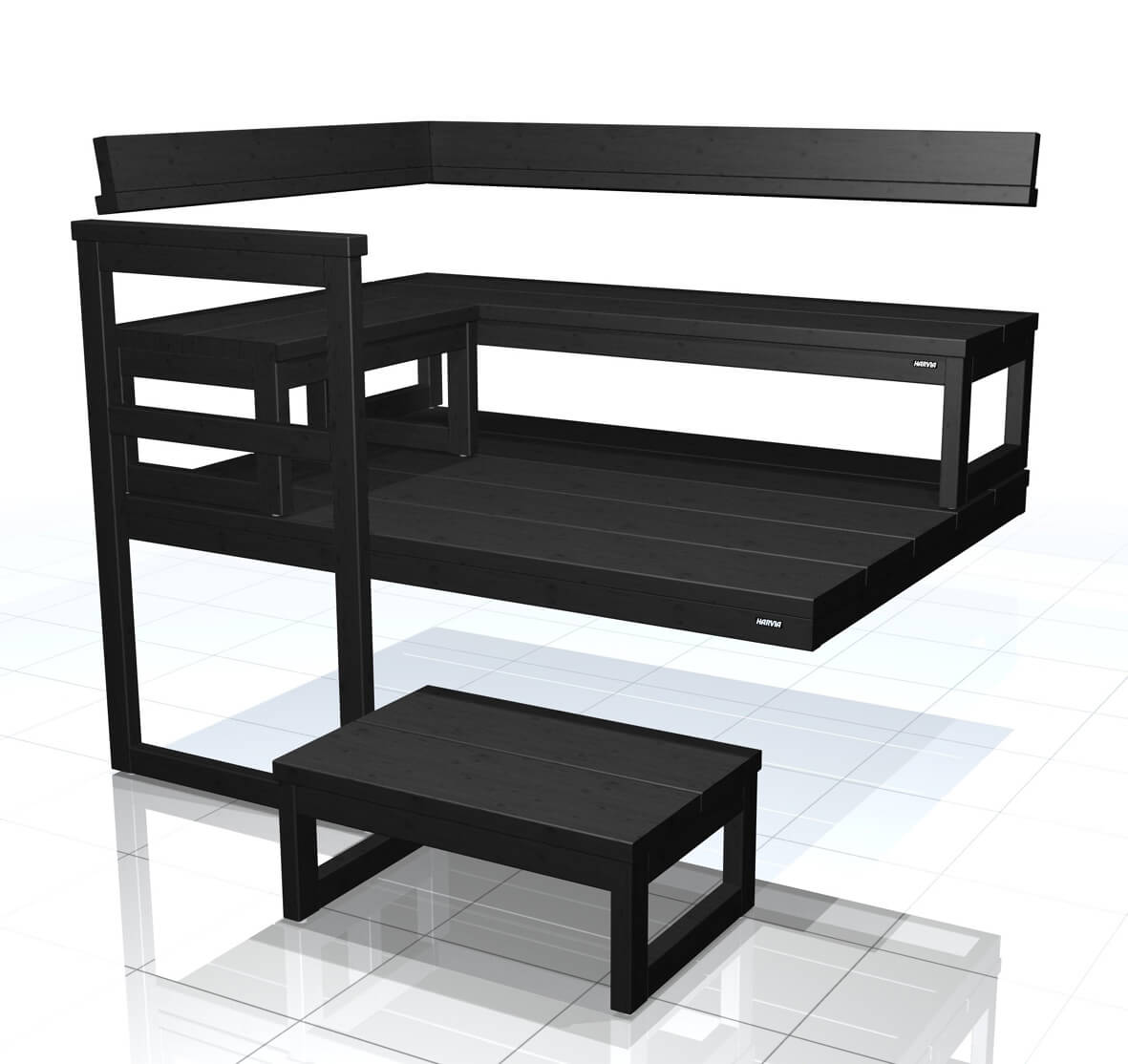 Solide-Liegen kombinieren uralte Saunatraditionen mit einem innovativen und modernen Design. Das glatte und einfache Design bietet eine ansprechende Kombination von heller sowie schwarzer Farbe und passt perfekt zum Stil neuer Eigenheime. Die Oberflächen können mit getöntem Saunafinish oder -wachs behandelt oder unbehandelt belassen werden, um die helle Farbe von Fichte hervorzuheben. Als Optionen für die Liegen sind eine durchgängige Liege oder einzelne Saunahocker erhältlich, die sich einfach umstellen lassen. Die Liegen sind an die Maße der Sauna angepasst.