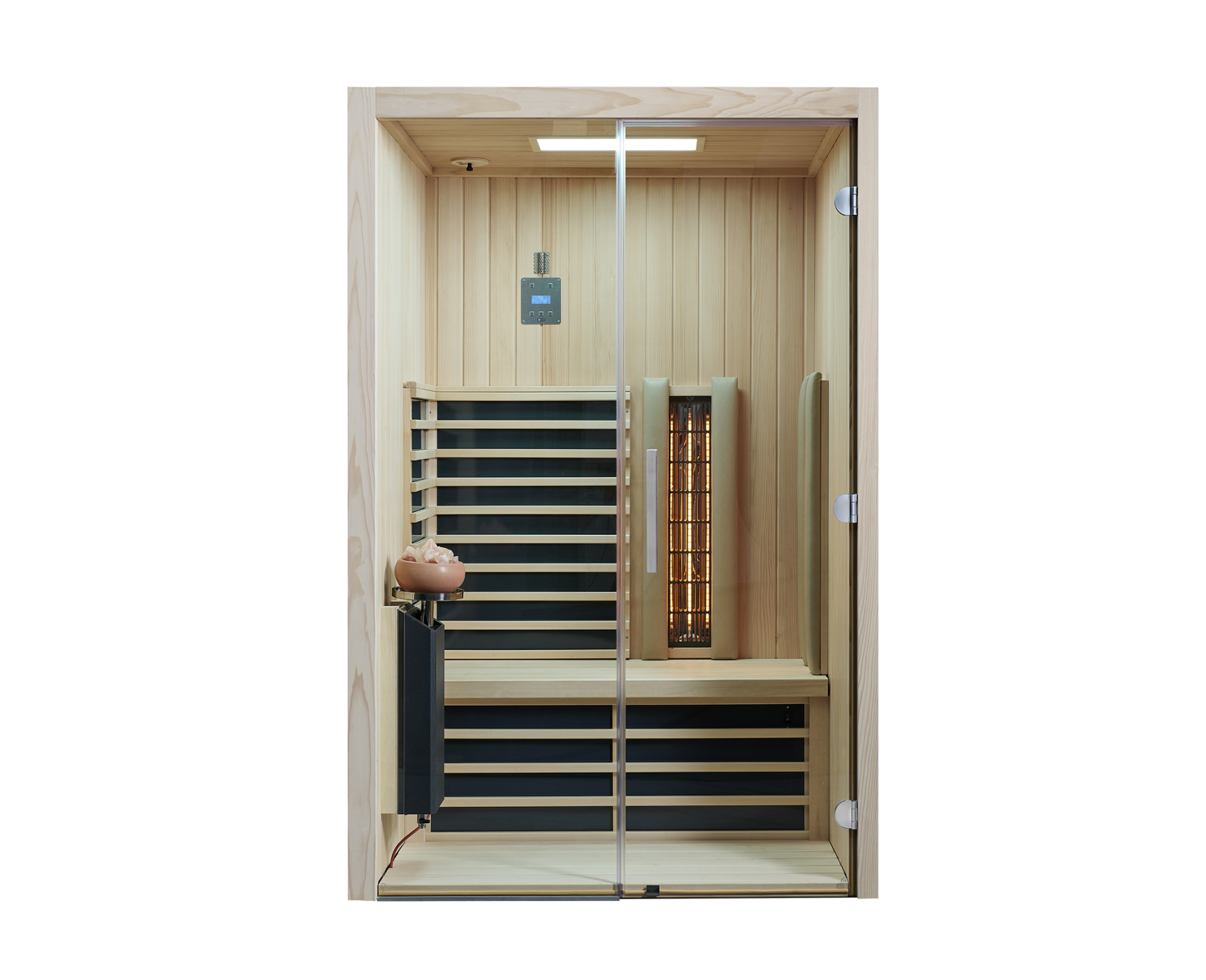 Infrarotkabine aus hellem Tannenholz mit Glasfront und anthrazitgrauen Flächenheizungspaneelen. Der Salzverdampfer und 2 VITALligt-Infrarotstrahler sorgen für den perfekten Wellnessgenuss.