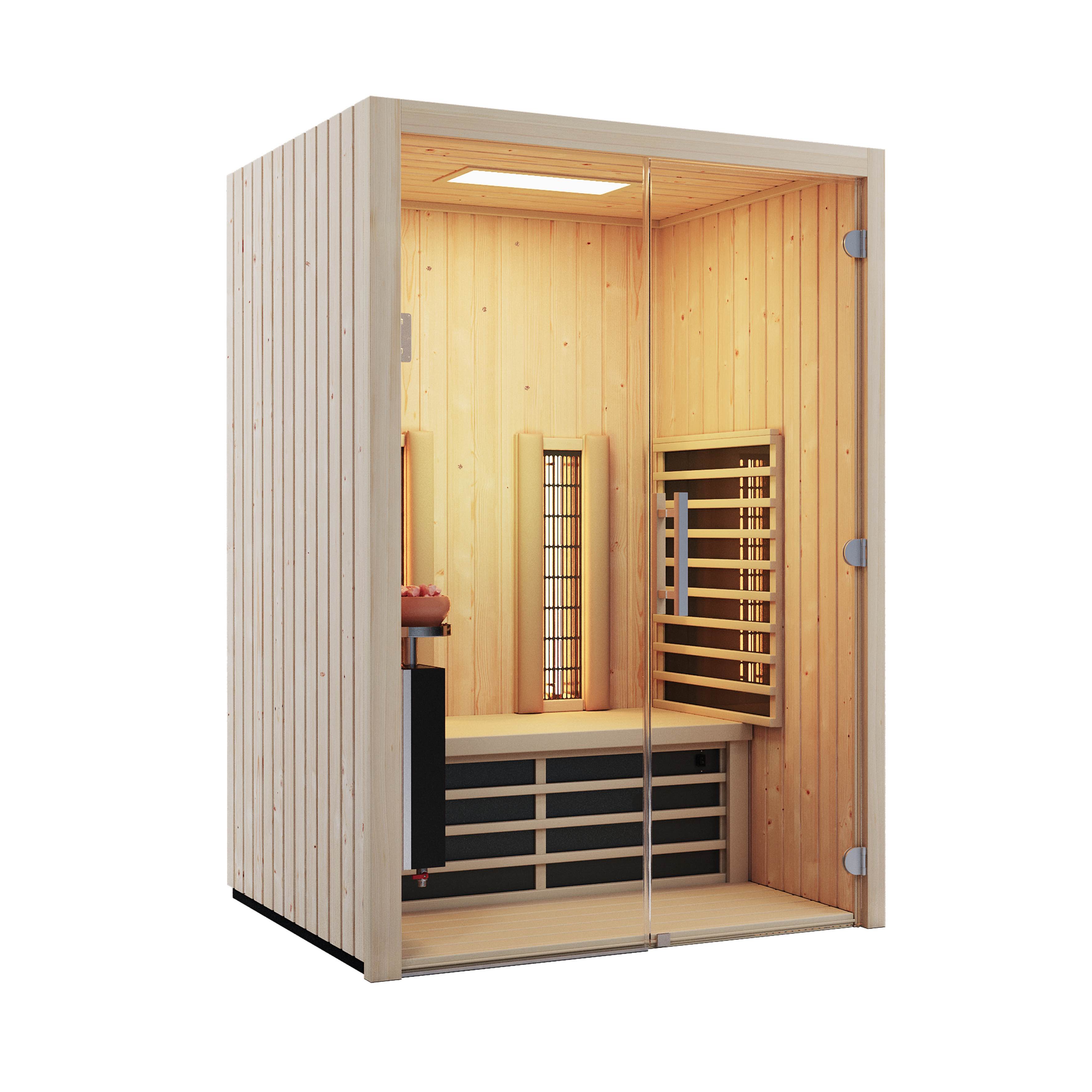 Diese neue Infrarotkabine aus nordischer Fichte und anthrazitgrauen Flächenheizungspaneelen ist mit TrioSol-Technologie und zwei VITALlight-Infrarotstrahlern in der Rückwand ausgestattet.