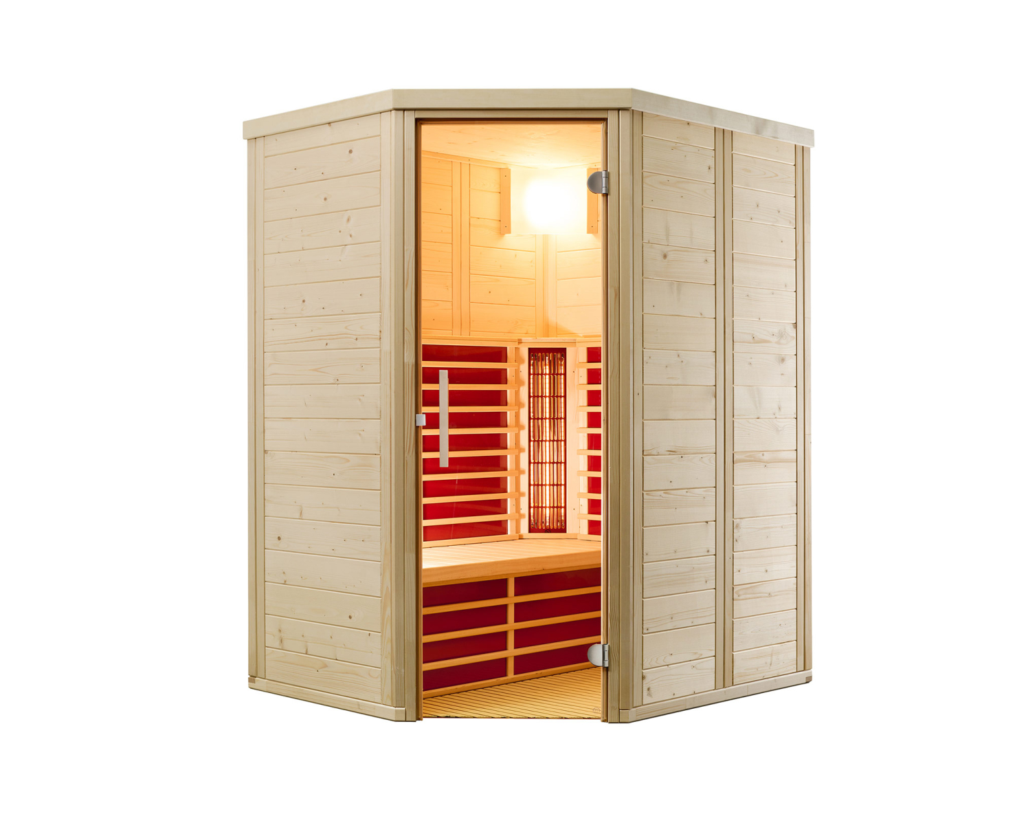 Besonders geräumige Infrarotkabine aus Vollholz, mit TrioSol-Technologie und Eckeinstieg