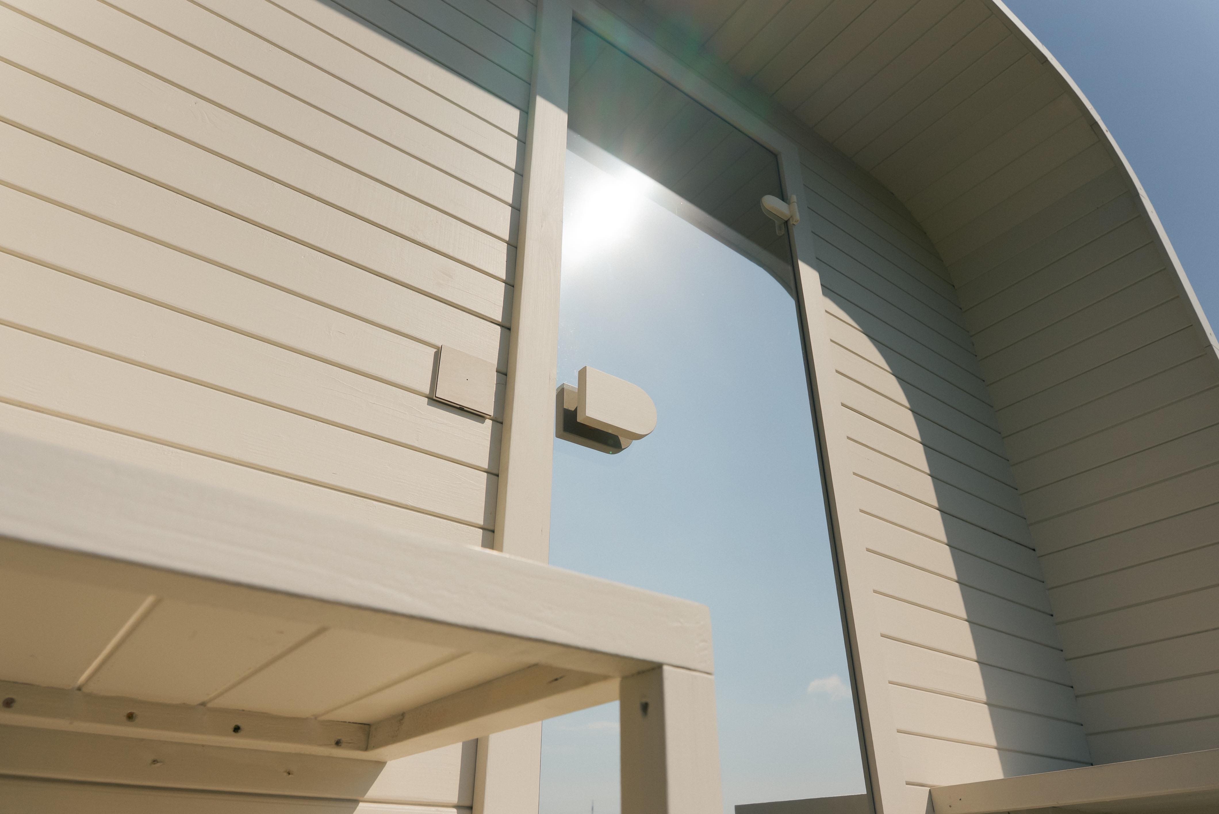 Passen Sie das Erscheinungsbild Ihrer Sauna an Ihren individuellen Stil an. Wählen Sie zwischen einer natürlich geölten Oberfläche, die die Holzmaserung betont, oder einer lackierten Außenseite für einen markanten, eleganten Look. Jede Variante ist behandelt, um Witterungseinflüssen standzuhalten und zeitlose Ästhetik zu bieten.