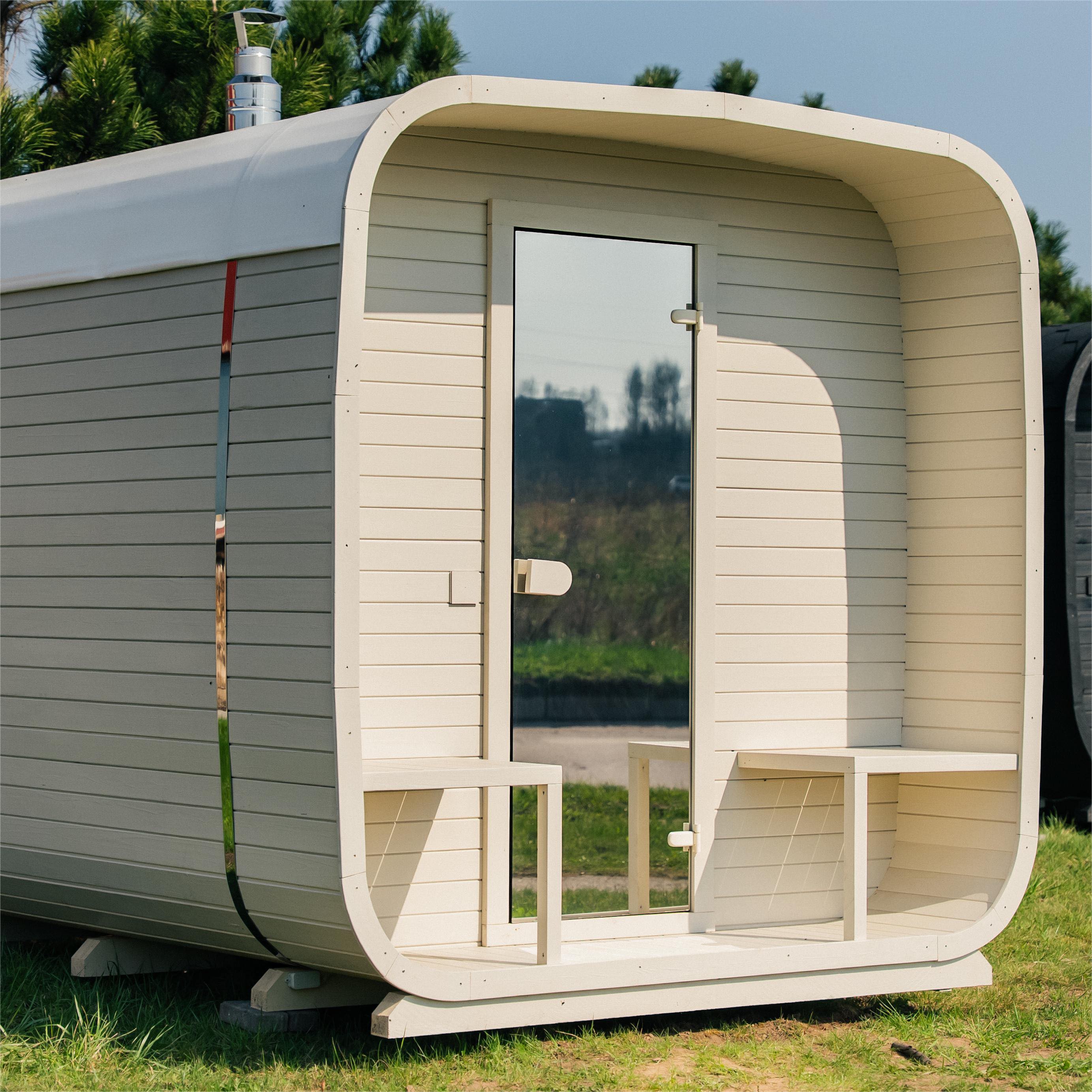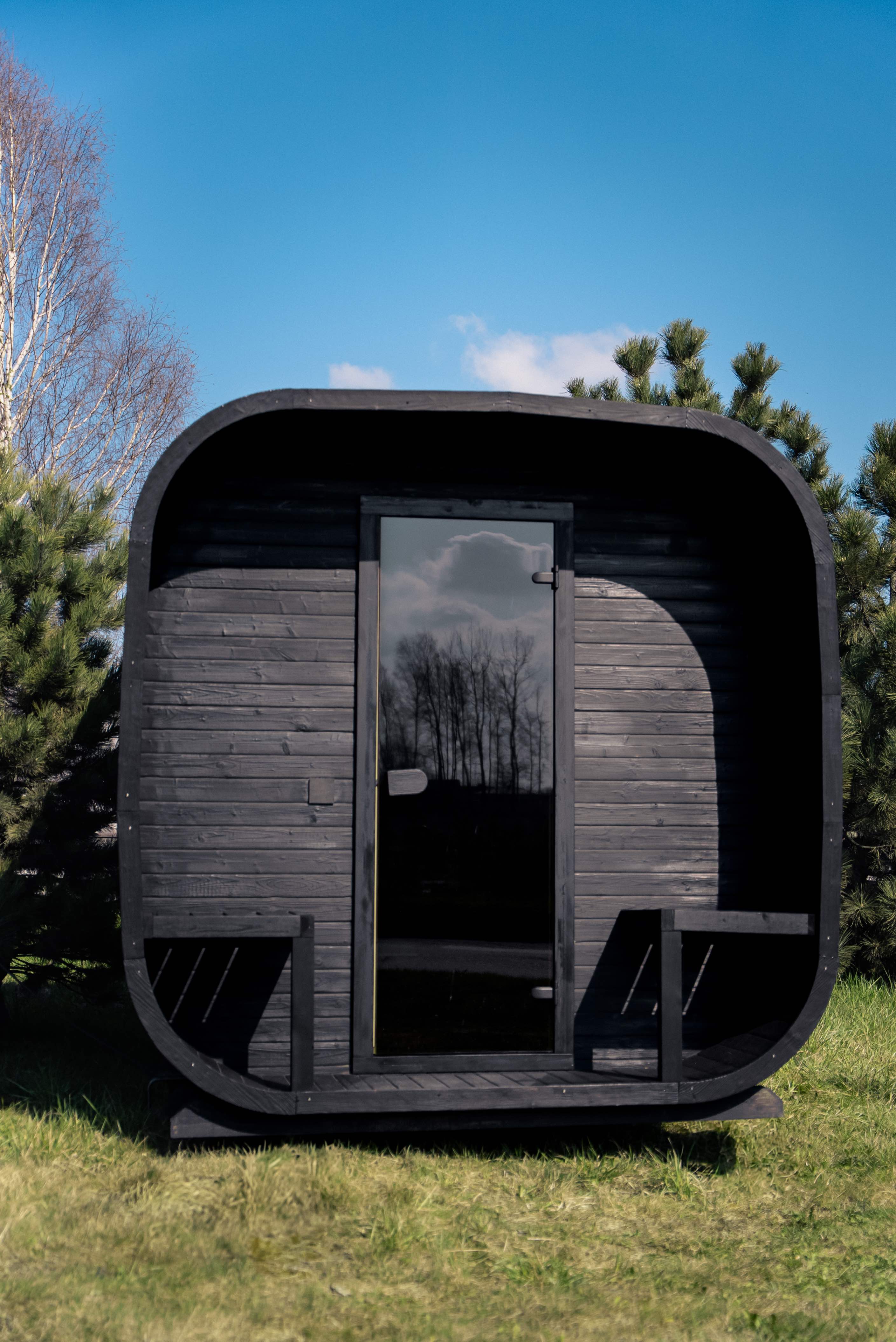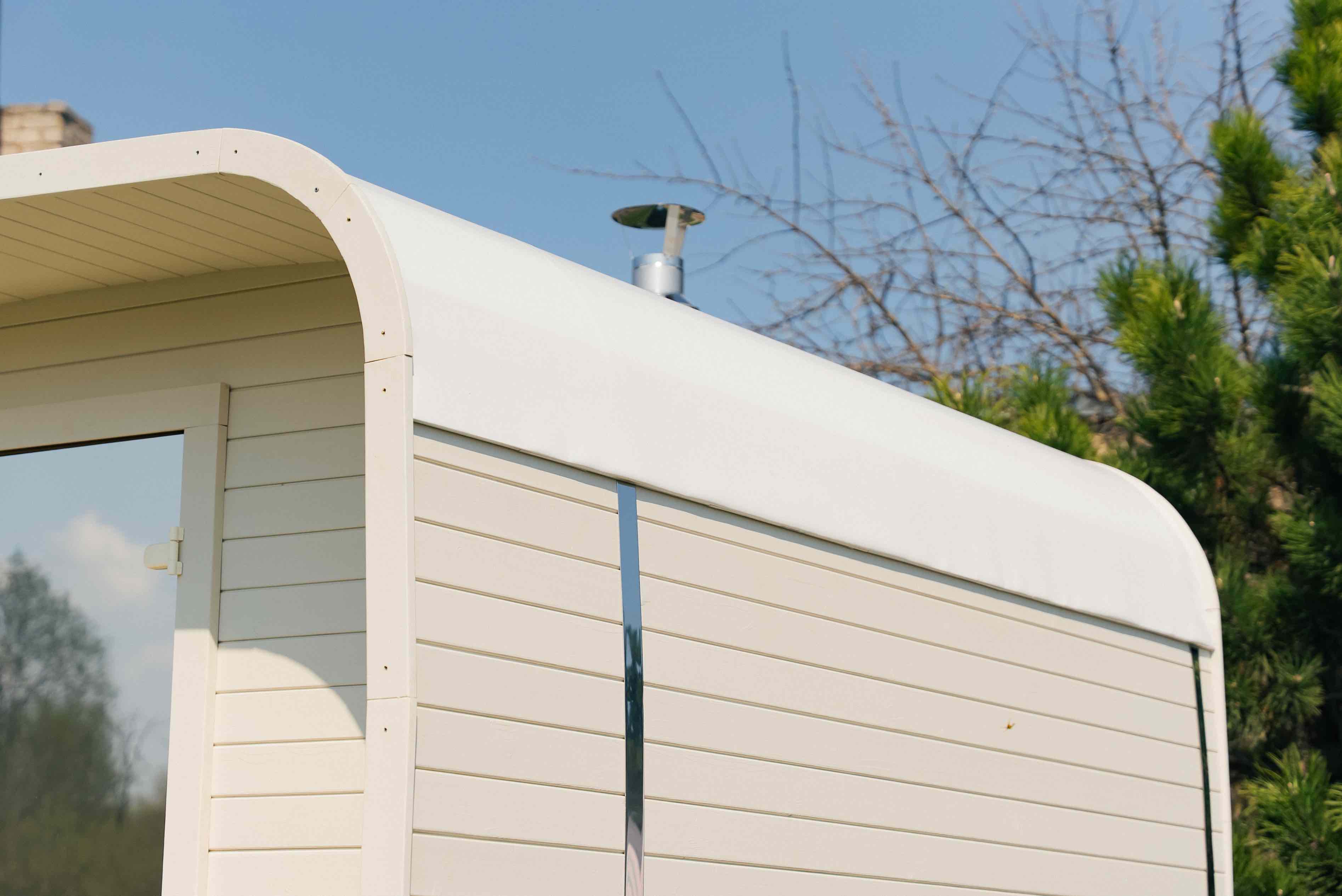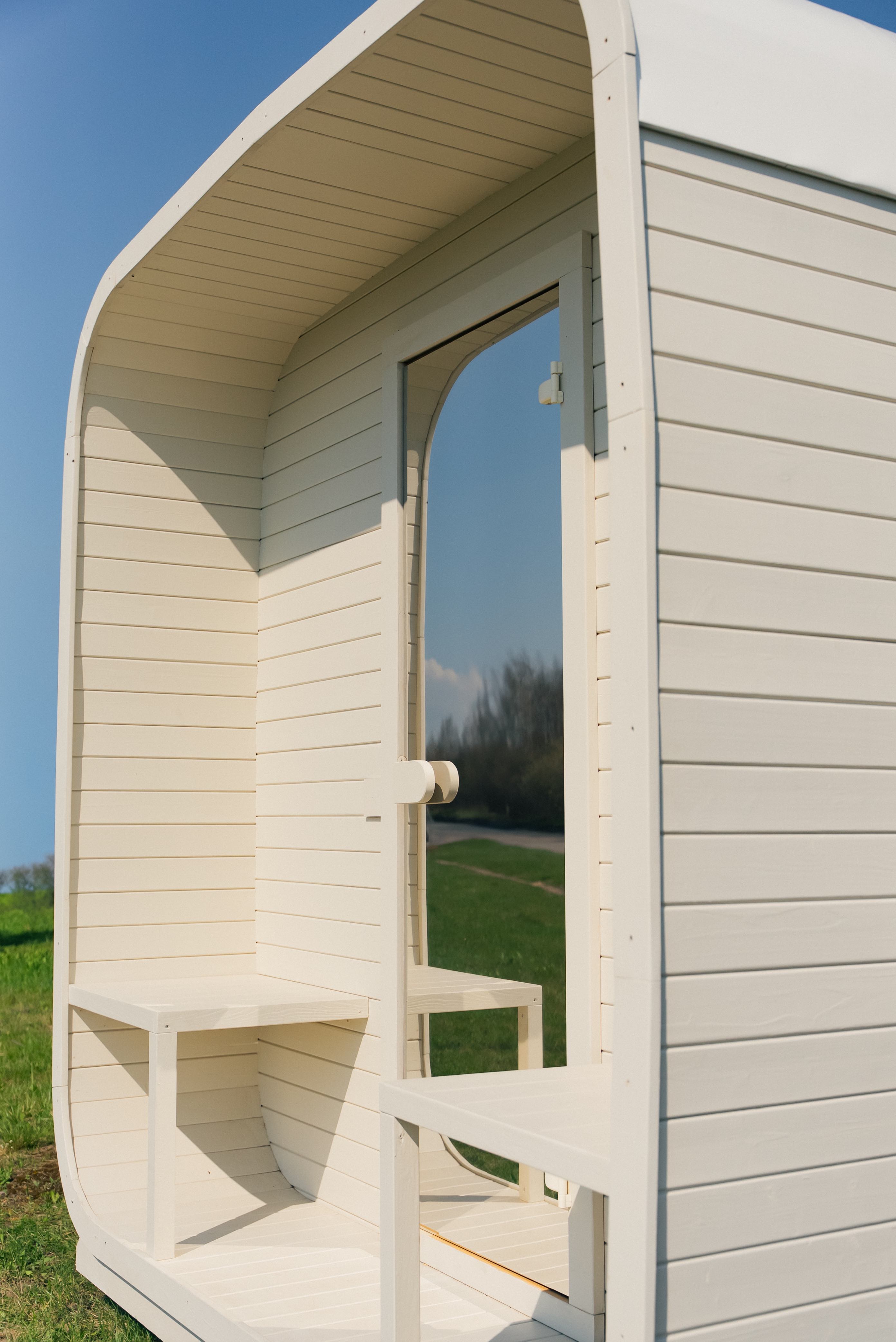 Ula Grand ist eine edle Außensauna für 6 Personen, die das gleiche elegante, geschwungene Design wie die Ula Classic bietet – nun erweitert um eine verandaartige Vorderseite. Mit Abmessungen von 2,78 x 2,36 m und einer Höhe von 2,4 m schafft die Ula Grand zusätzlichen Raum zur Entspannung, ohne ihren zeitlosen Stil zu verlieren – perfekt für modernes Leben im Freien.