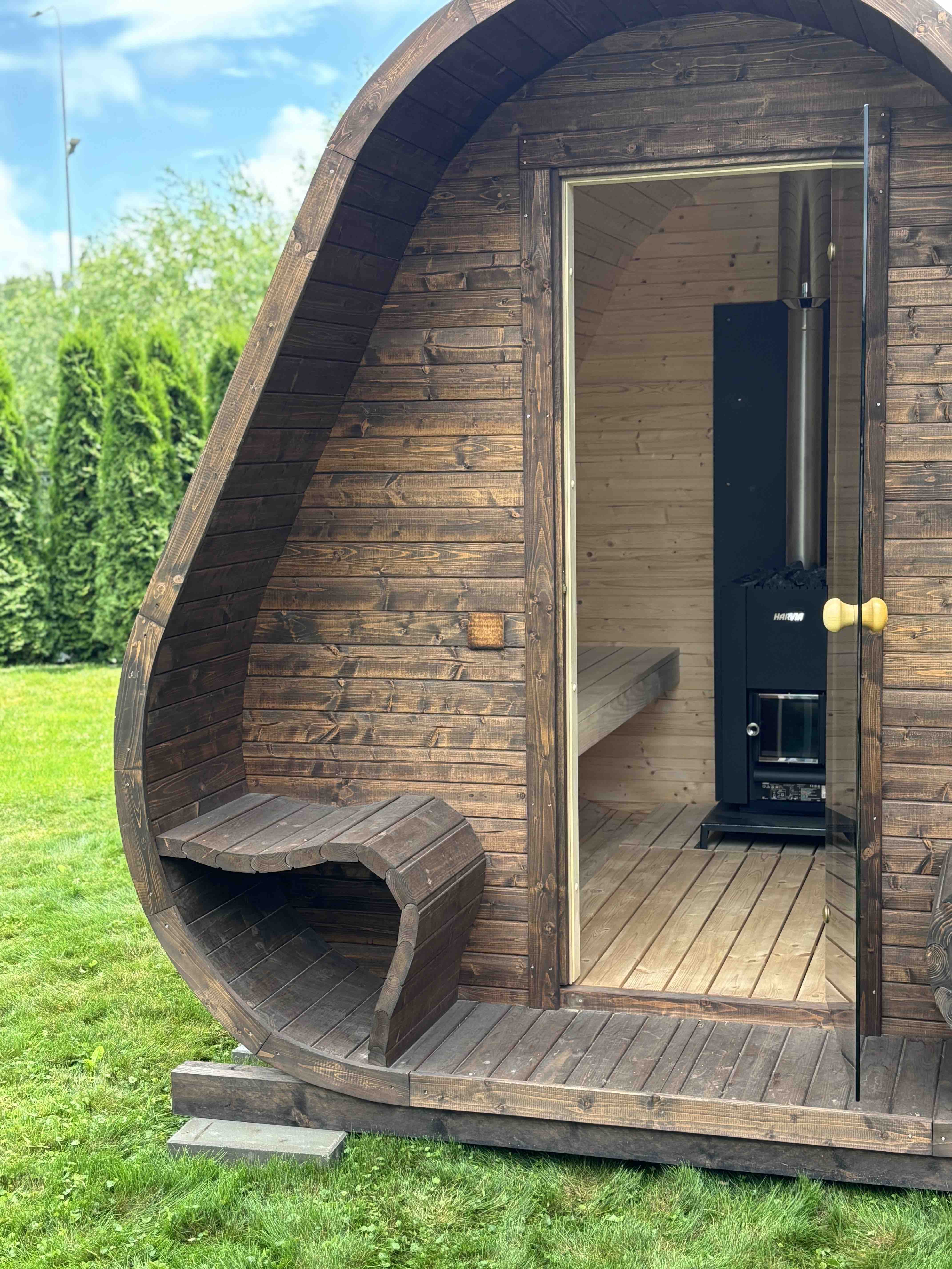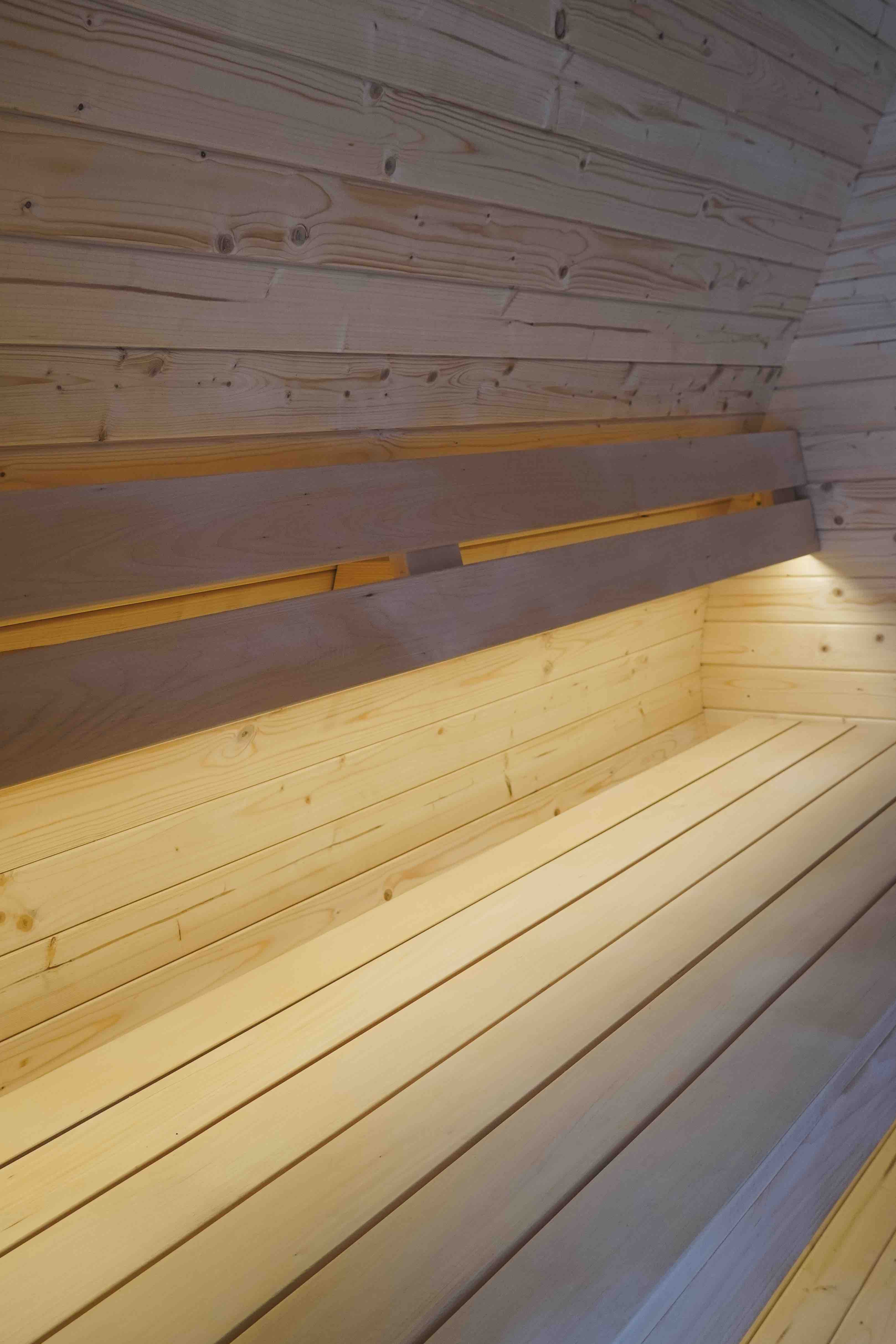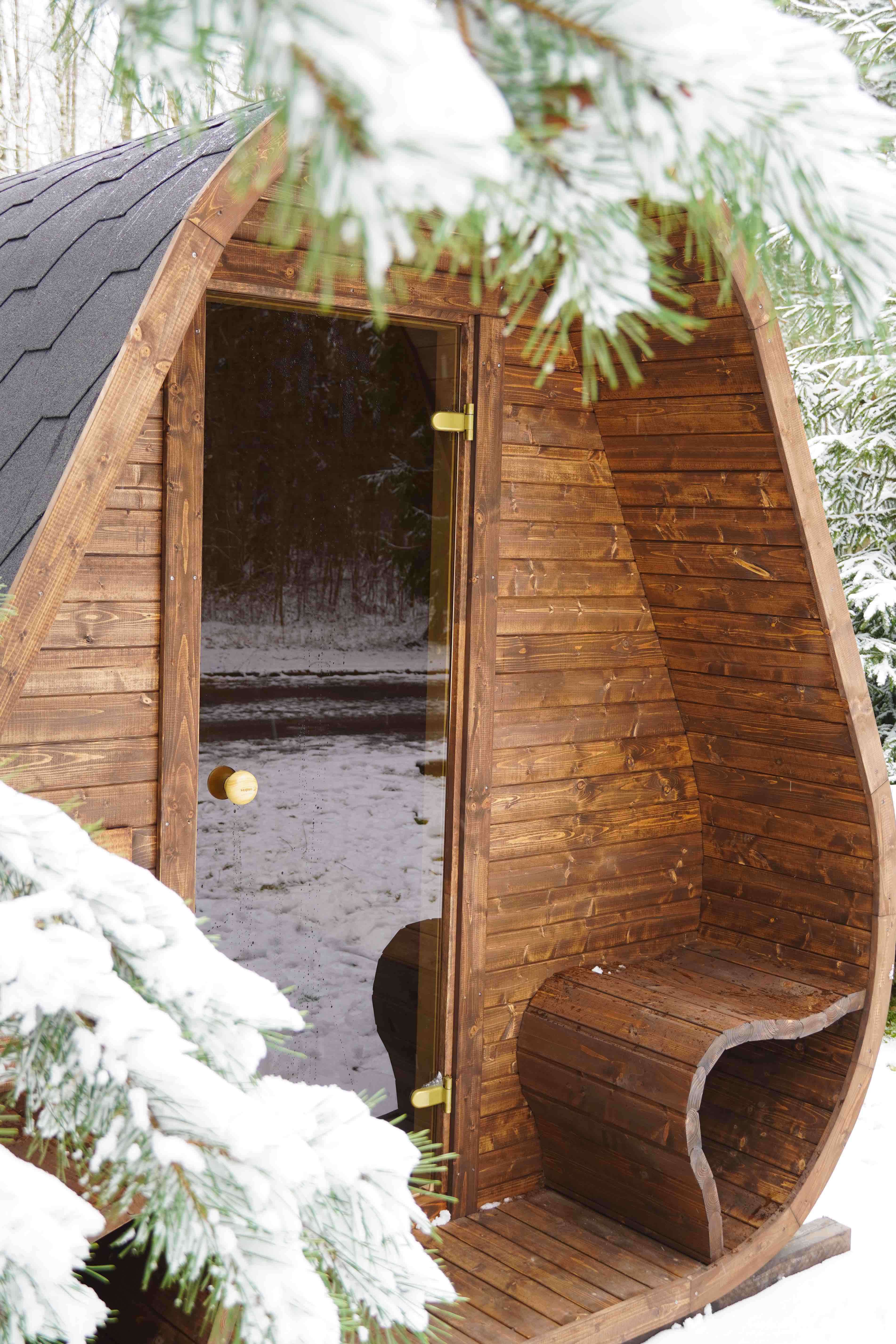 Herkus Grand beeindruckt mit einem markanten, skulpturalen Erscheinungsbild und erweitert den Komfort durch eine integrierte vordere Veranda. Mit den Maßen 2,78 x 2,37 m und einer Höhe von 2,43 m ist sie ideal für 6 Personen und vereint ausdrucksvolle Ästhetik mit funktionalem Raum. Das geschwungene Innere und die warmen Holztöne schaffen eine gemütliche Atmosphäre, die zu tiefer Entspannung einlädt.