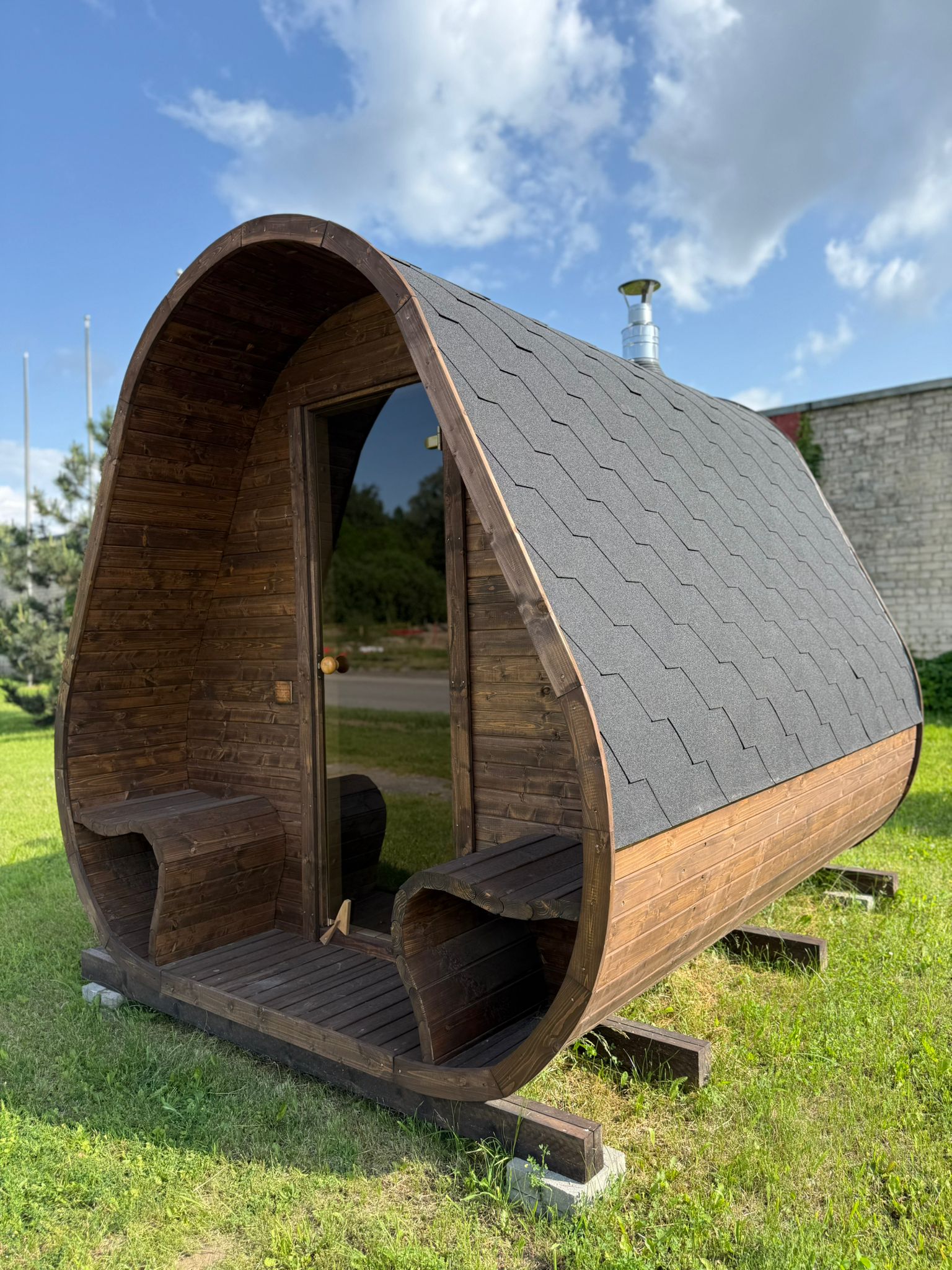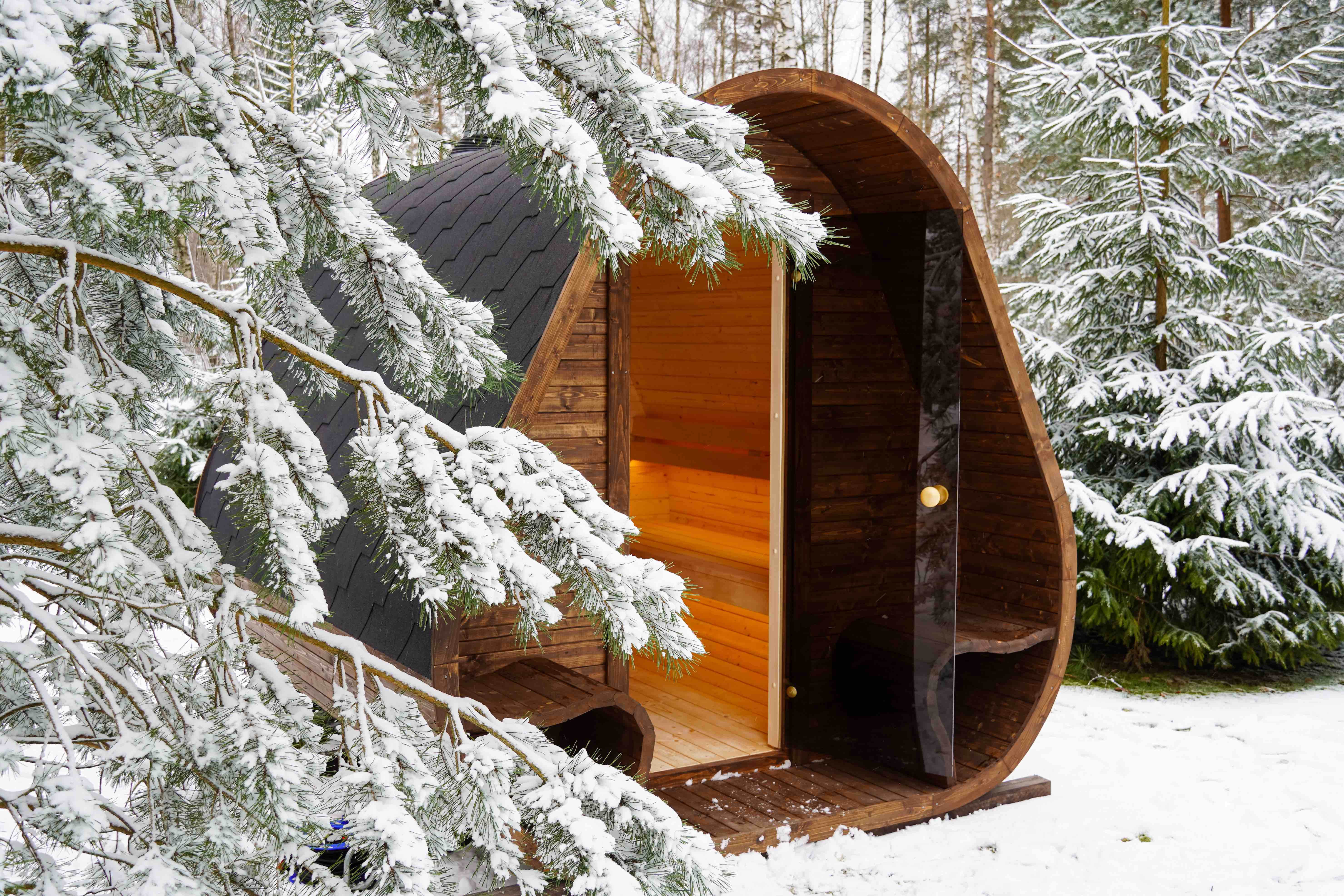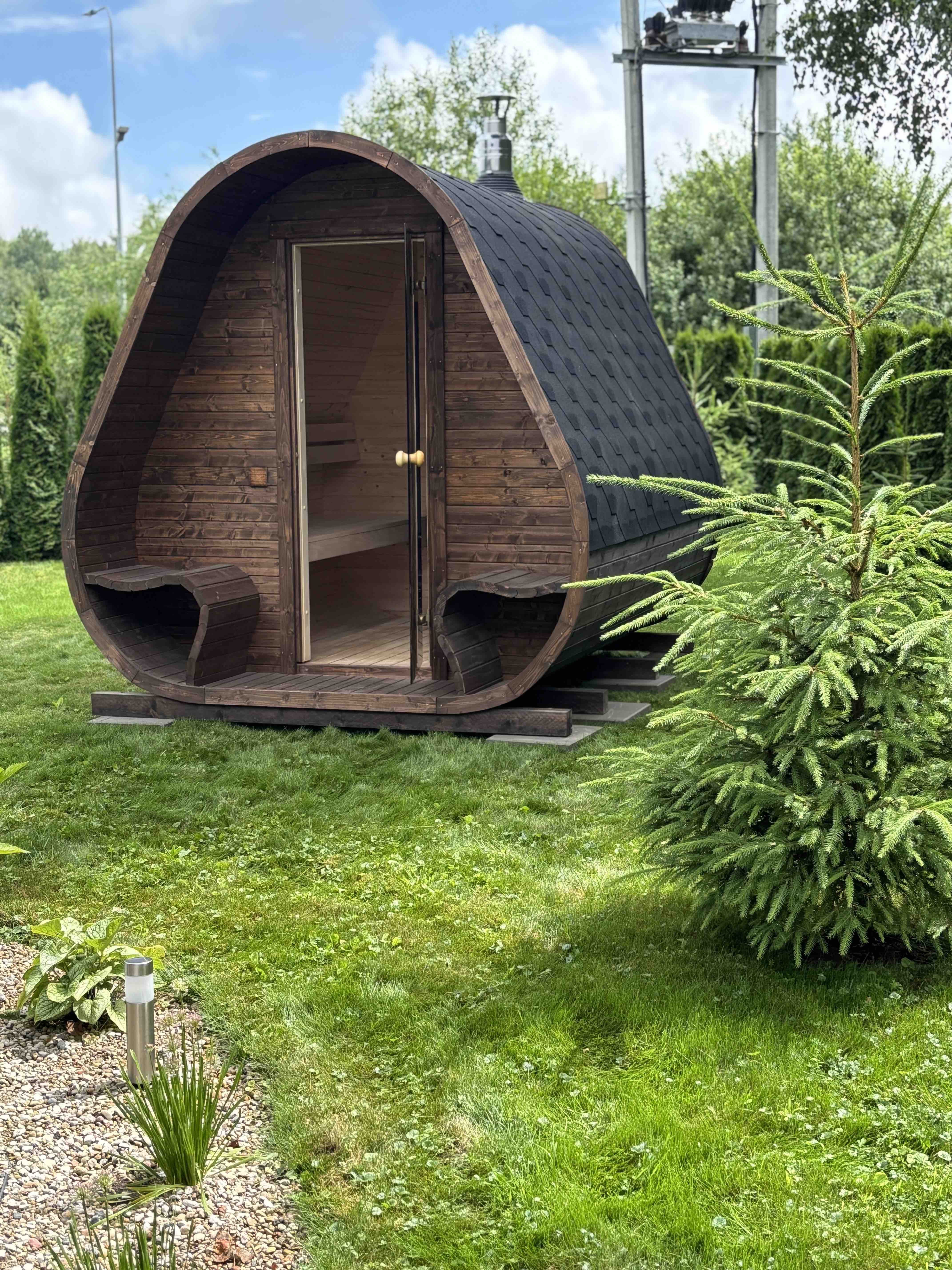 Herkus Grand beeindruckt mit einem markanten, skulpturalen Erscheinungsbild und erweitert den Komfort durch eine integrierte vordere Veranda. Mit den Maßen 2,78 x 2,37 m und einer Höhe von 2,43 m ist sie ideal für 6 Personen und vereint ausdrucksvolle Ästhetik mit funktionalem Raum. Das geschwungene Innere und die warmen Holztöne schaffen eine gemütliche Atmosphäre, die zu tiefer Entspannung einlädt.
