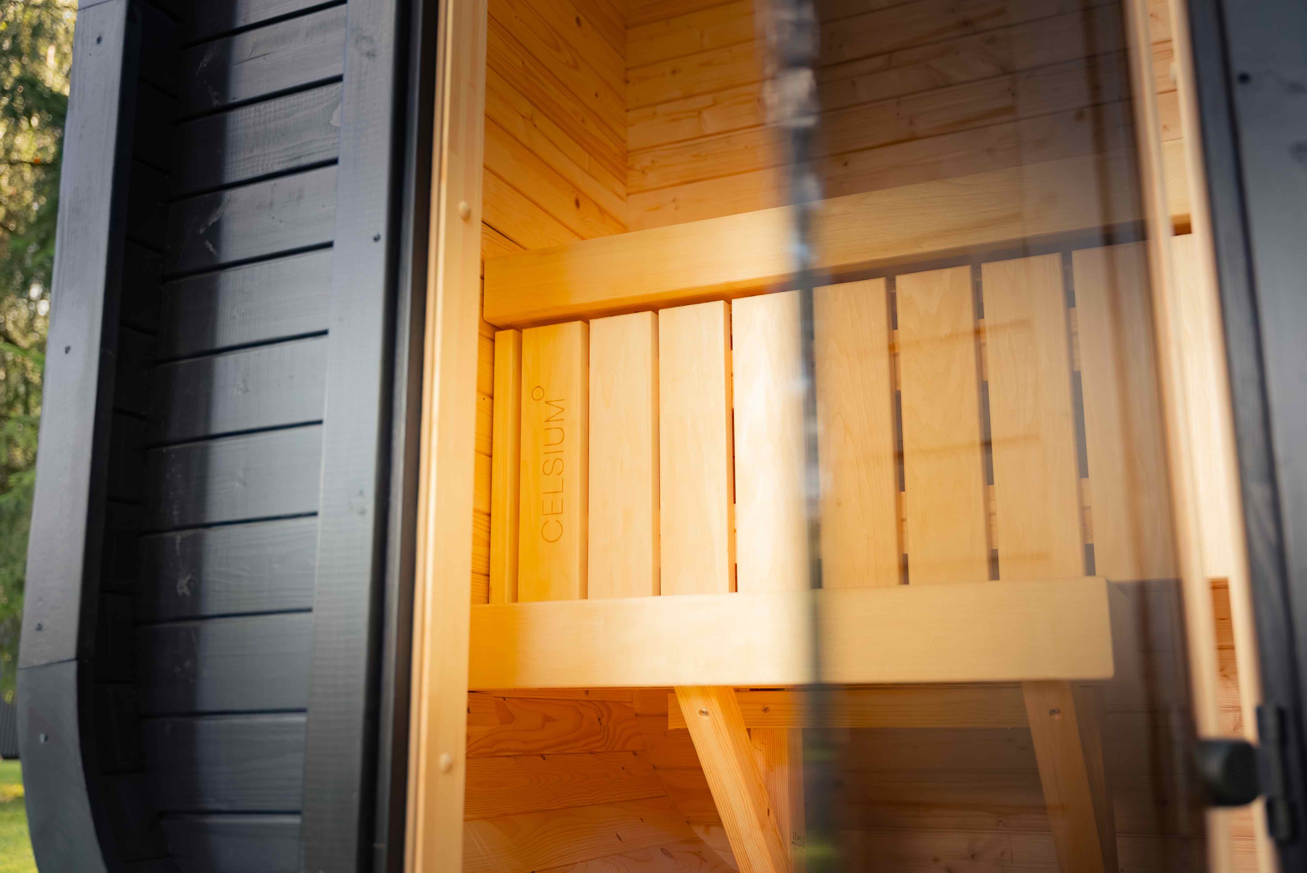 Wähle aus drei unterschiedlichen Holzarten, um den Stil und die Funktion deiner Sauna perfekt abzustimmen: klassische Fichte für einen klaren, natürlichen Look; ausdrucksstarkes Shou Sugi Ban (verbrannte Fichte) für eine tief strukturierte Oberfläche; oder Thermokiefer, wärmebehandelt für erhöhte Stabilität und eine warme Ausstrahlung.