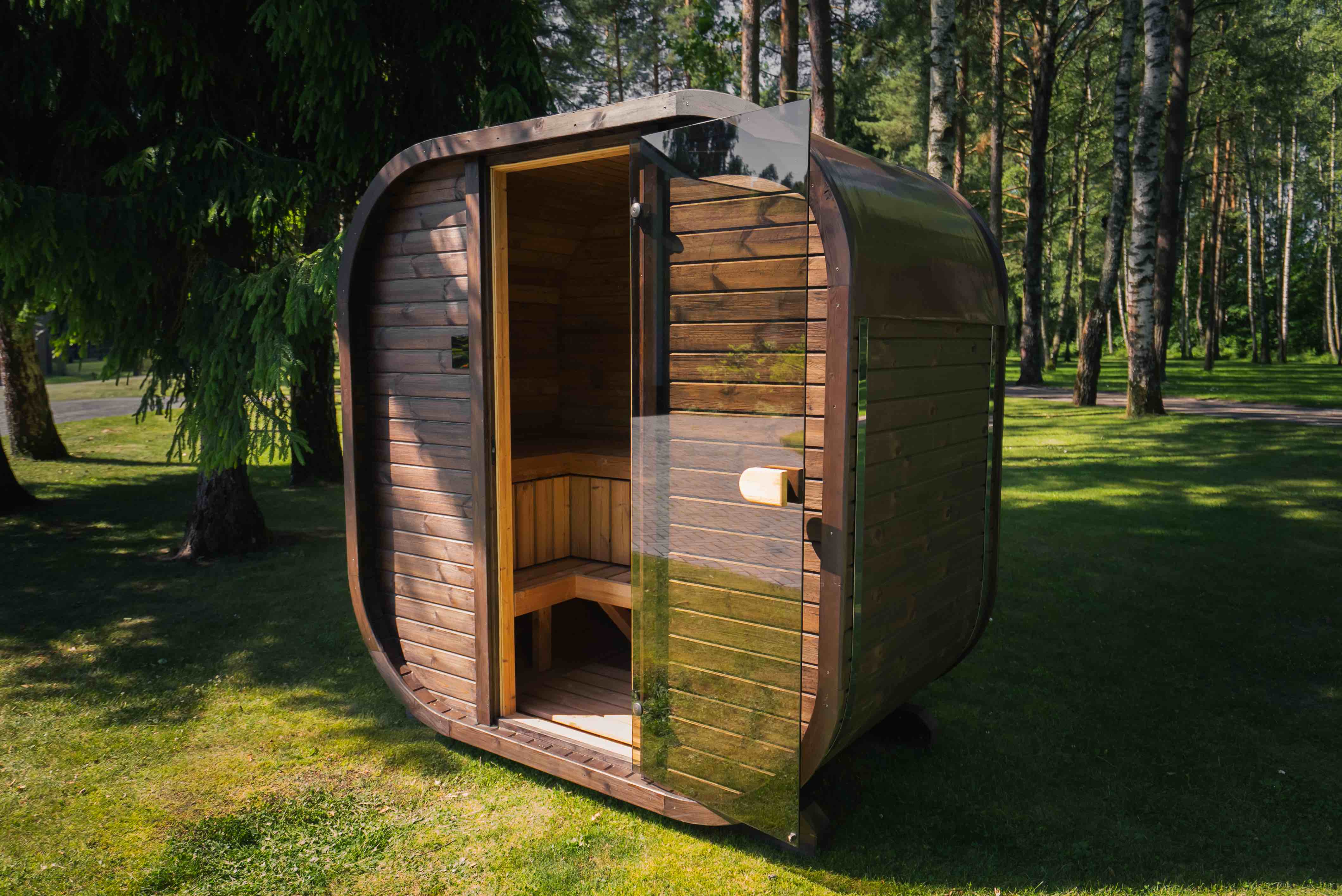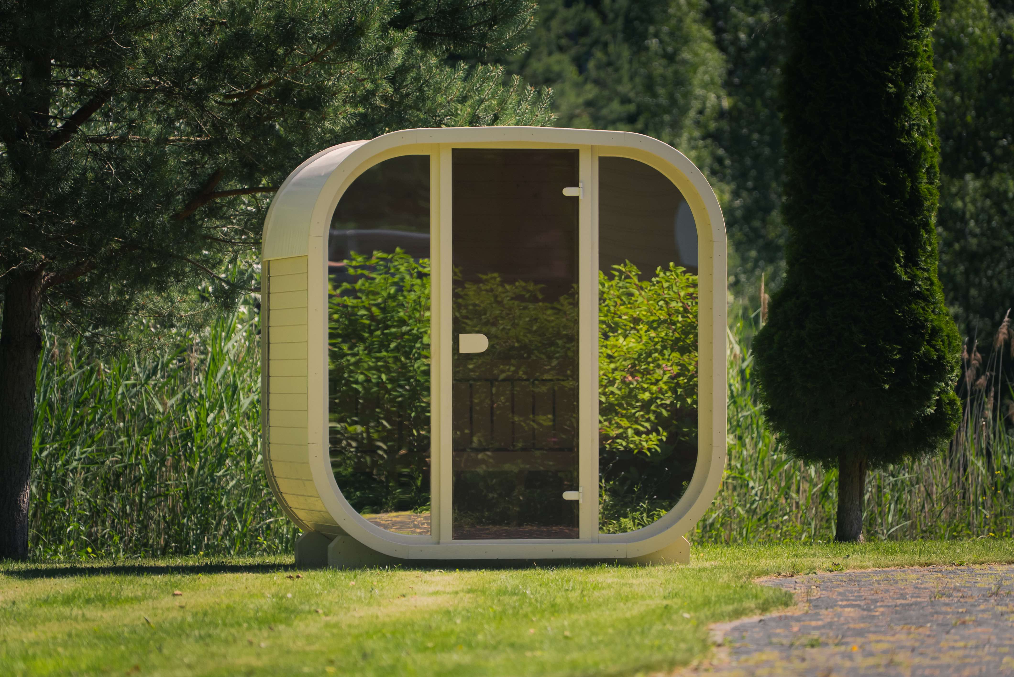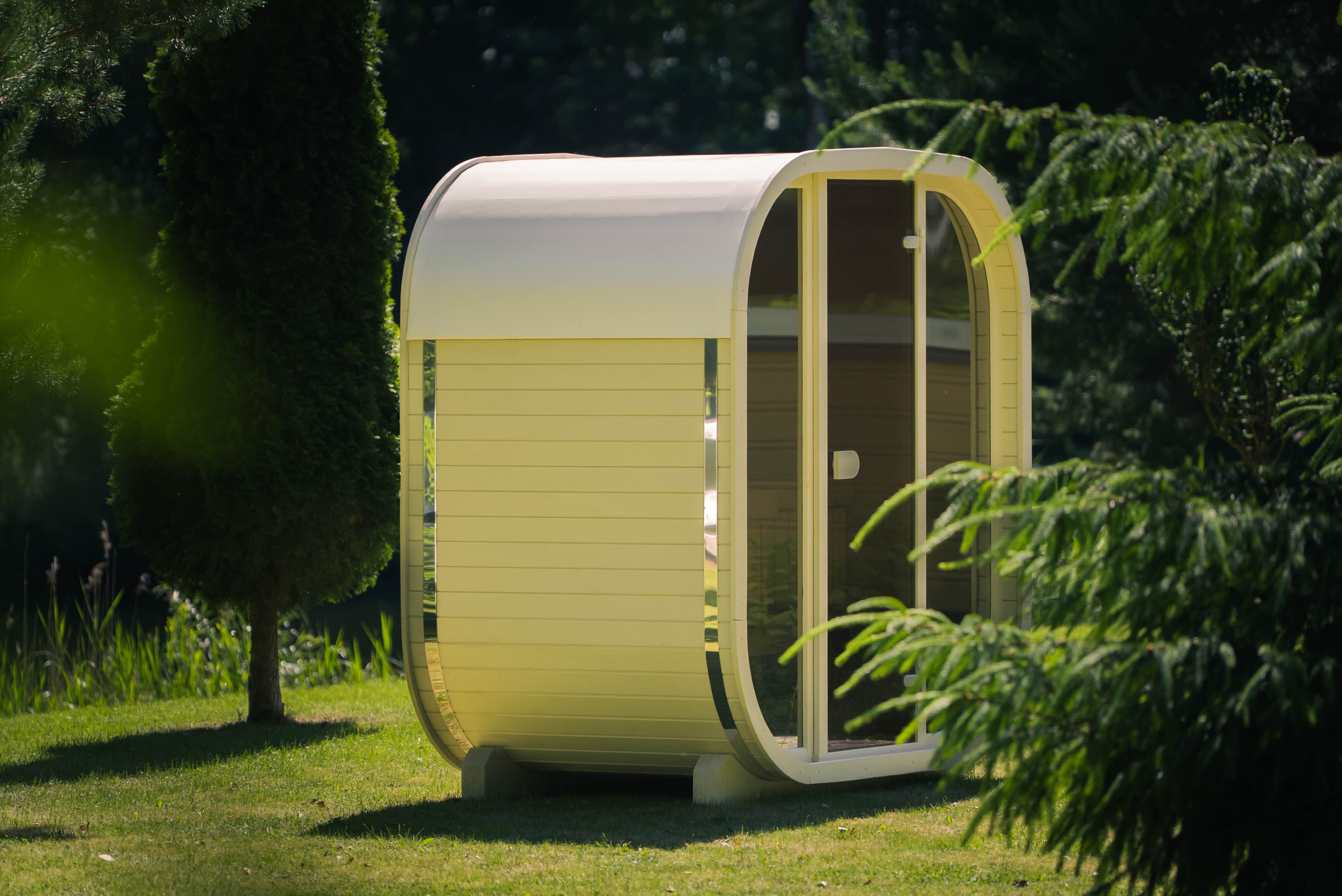 Moderne Sauna mit einem markanten, abgerundeten Design, das sich deutlich von traditionellen Formen abhebt. Klare Linien und ein funktionales Layout machen sie zur perfekten Wahl – sowohl für urbane Umgebungen als auch für natürliche Rückzugsorte.