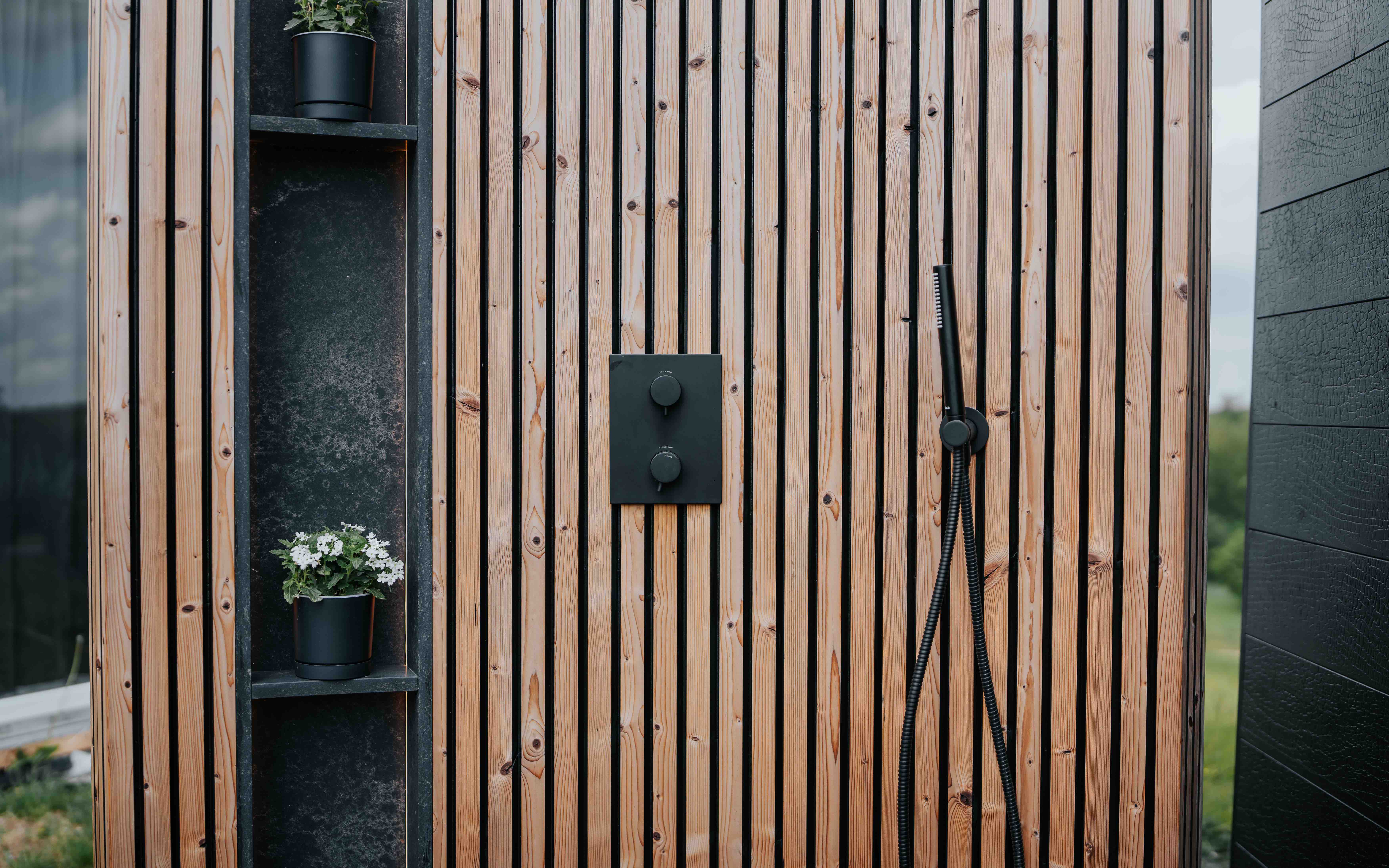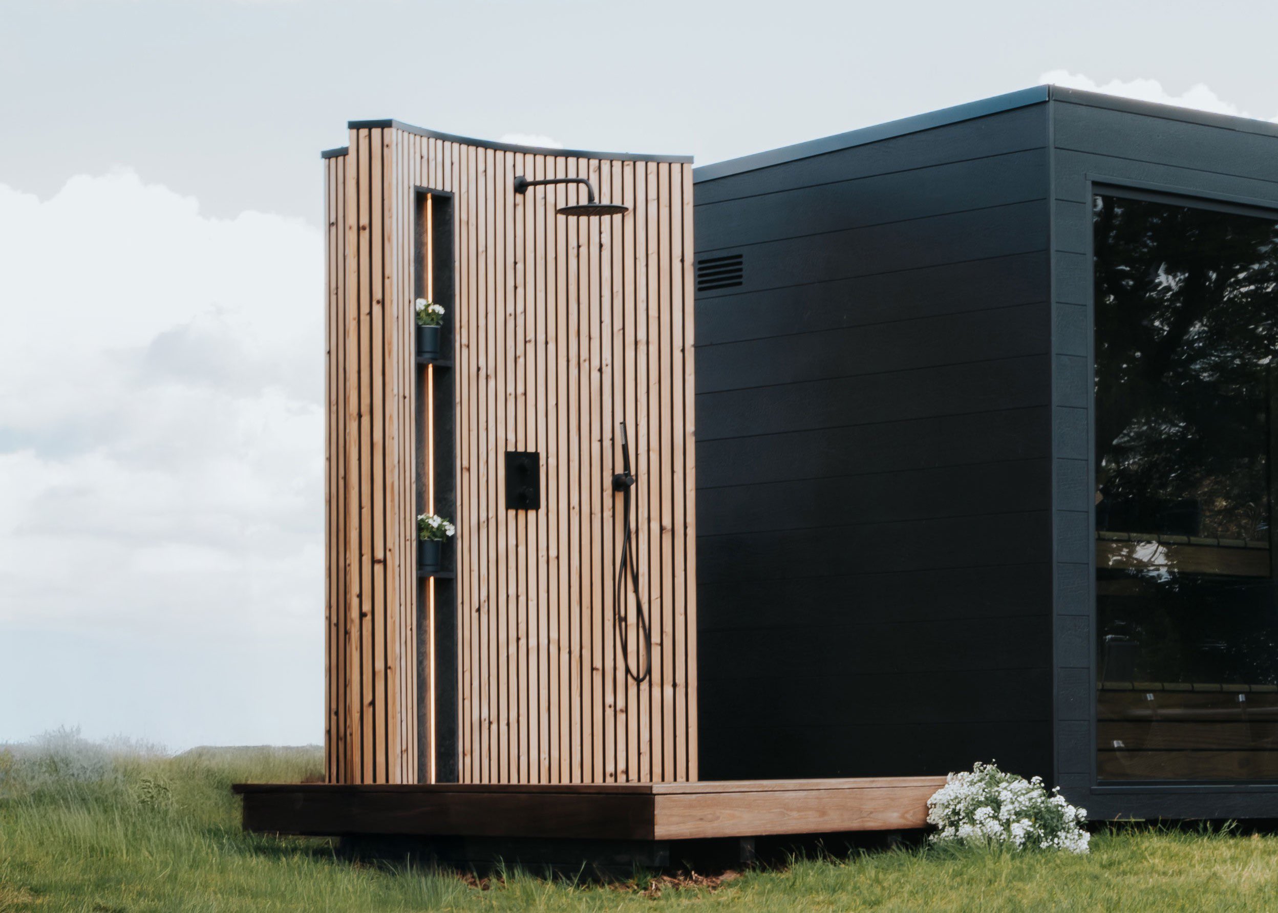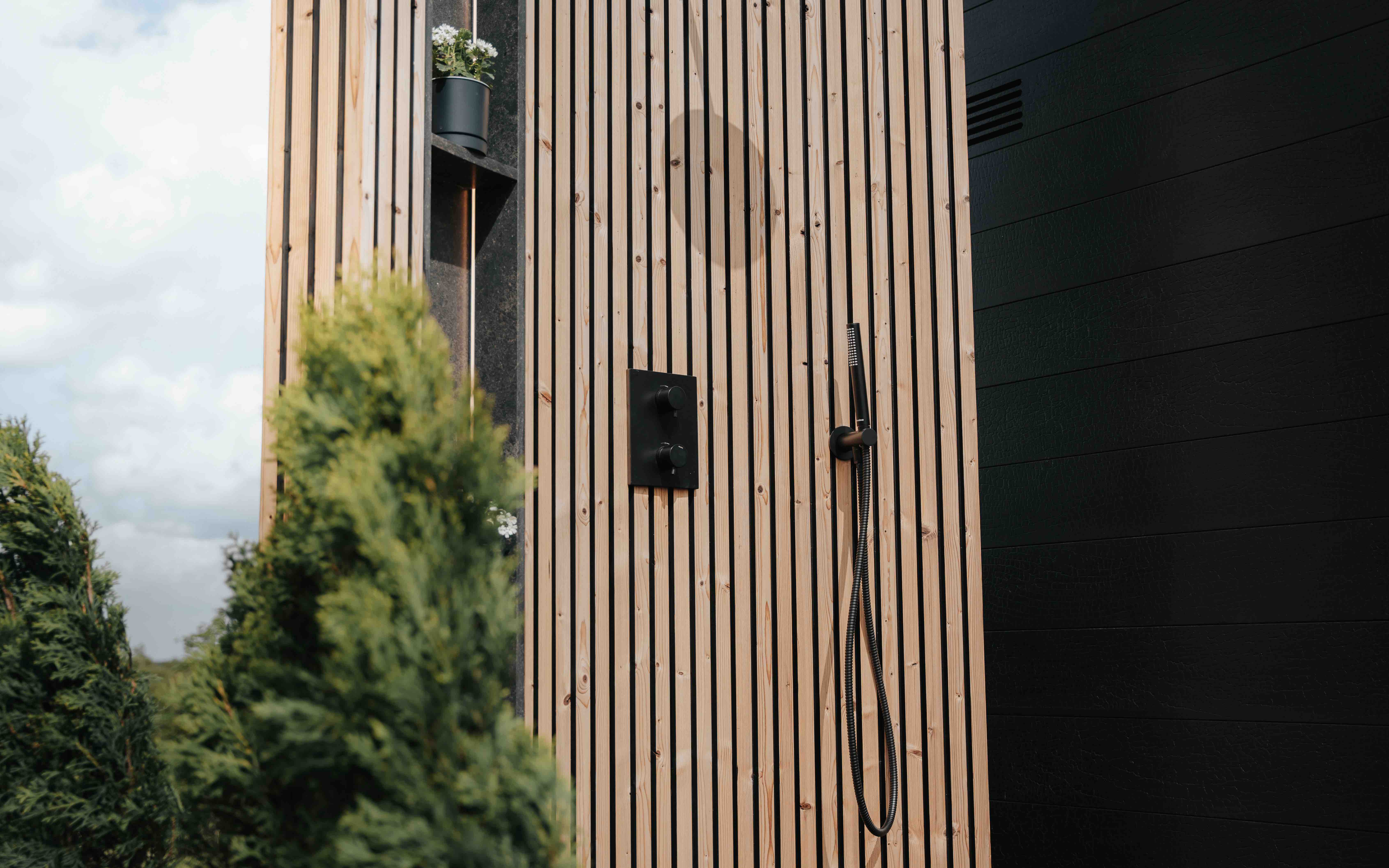 Eine stilvolle und funktionale Duschlösung – perfekt, um sich nach einer Saunasitzung abzuspülen oder sich an einem warmen Tag einfach abzukühlen. Entwickelt, um das Spa-Erlebnis nach draußen zu bringen.