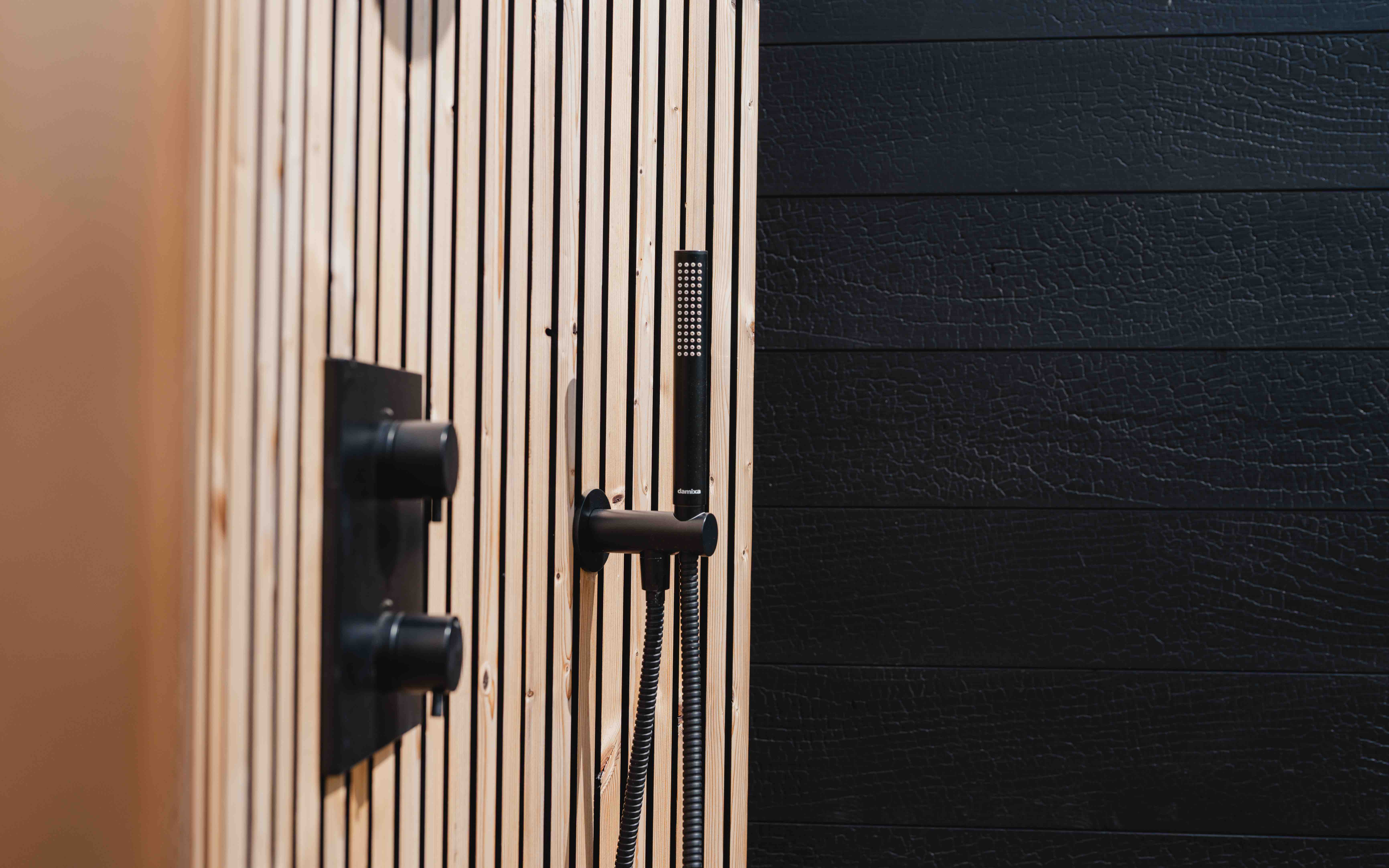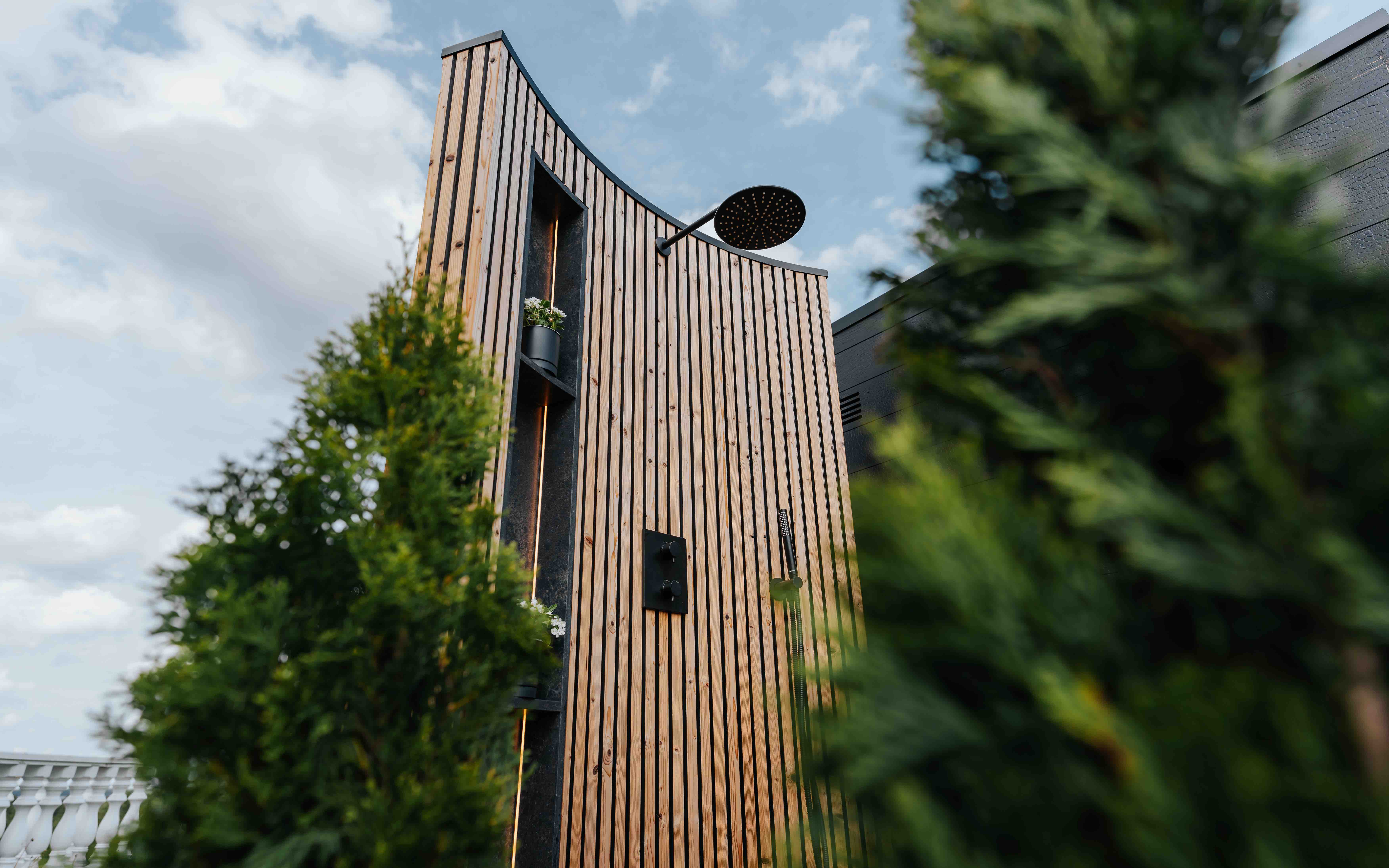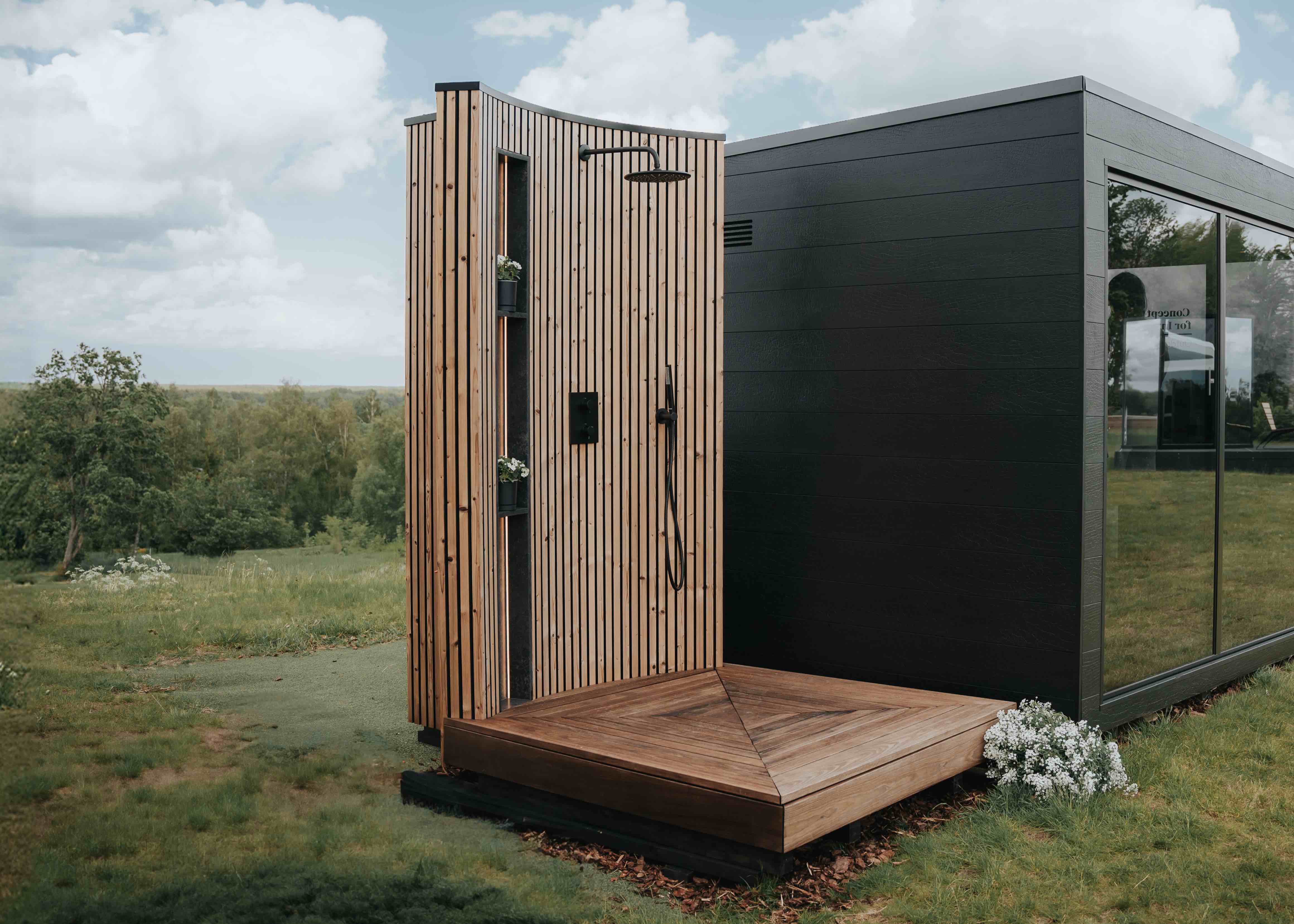 Eine stilvolle und funktionale Duschlösung – perfekt, um sich nach einer Saunasitzung abzuspülen oder sich an einem warmen Tag einfach abzukühlen. Entwickelt, um das Spa-Erlebnis nach draußen zu bringen.
