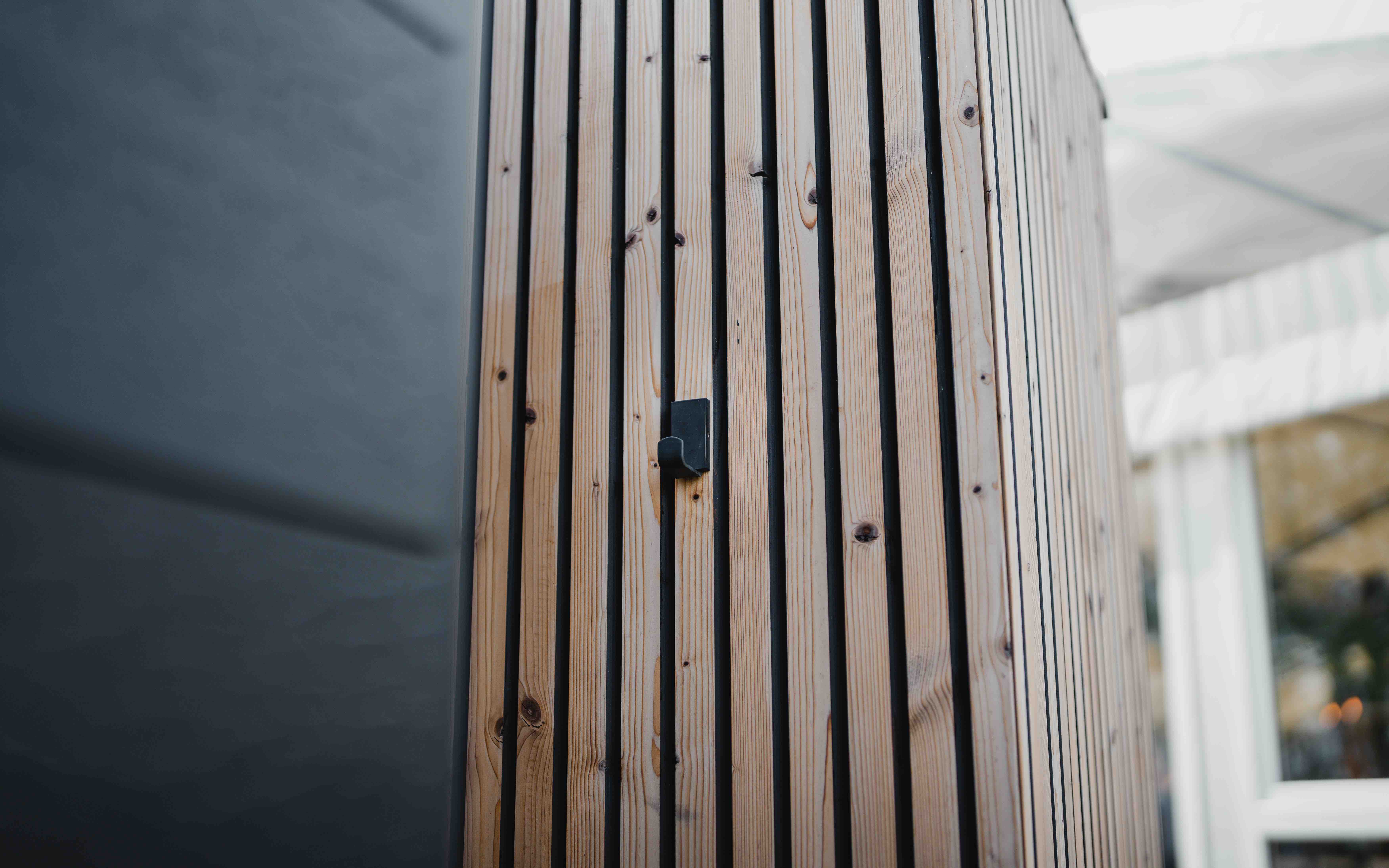 Gefertigt mit Thermory-Thermo-Fichtenverkleidung und Thermo-Eschenbelag präsentiert **VelAqua** langlebige Materialien, die mit der Zeit eine wunderschöne Patina entwickeln und sich harmonisch in die Natur einfügen.